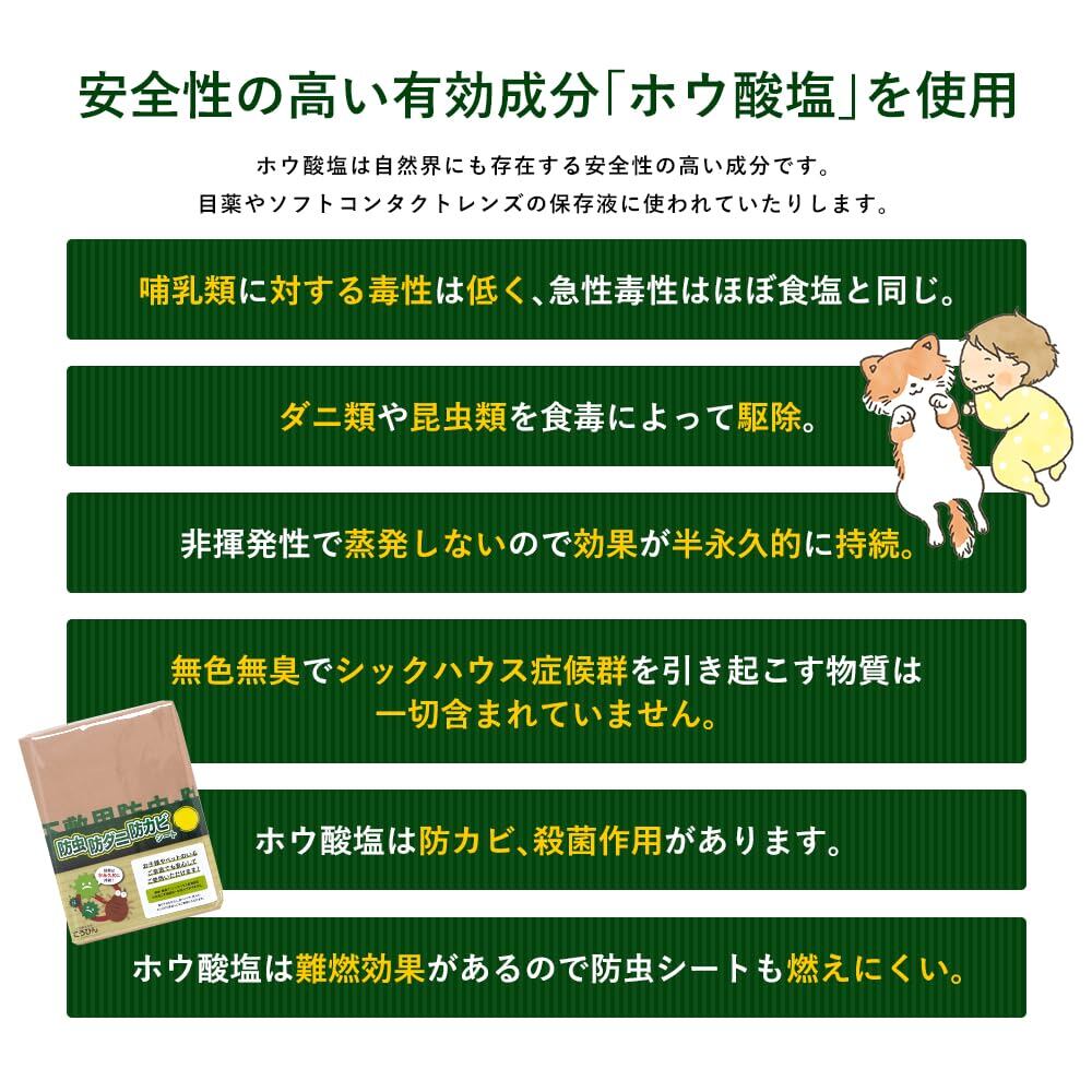 * ホウ酸塩は揮発性の物質ではないため、効果は半永久的に持続します。水溶性が高い物質のため、長時間にわたり水分などに浸かった状態が続くと、ホウ酸塩がシートから溶け出して、効果が減少します。ご注意ください。