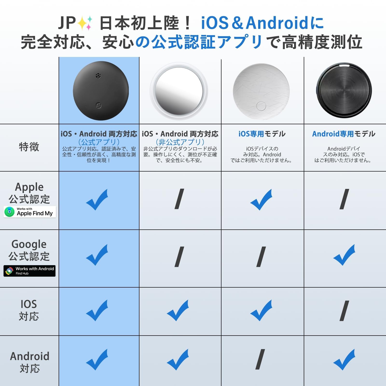 * ②【Apple × Google公式認証&技適無線認証】最強の安心登場!公式ダブル認証済み:iOS「探す」とAndroid「Google Find Hub」アプリ、両方の純正アプリに対応!データの安全性・プライバシー保護は業界トップクラス。非公式アプリ不要で純正アプリによるスムーズな操作と高精度測位を実現!日本Giteki無線認証(認証コード:R 210-233144 型番:S15)取得:合法周波数帯を使用し、日本の技術基準に完全適合。無線通信の安定性と安全性を保証し、屋内外どこでも途切れない接続を実現!信号干渉の心配なく、法令遵守で安心の正規品です。【Apple × Google公式認証と無線認証の効果】 純正アプリ対応で操作はシンプル&快適! Apple × Googleの最先端暗号化で位置情報を完全保護! 当社および第三者による個人情報の取得は一切なし。プライバシーがしっかり守られます。 Apple製品・主要Android機種との完全互換を保証。純正アプリ対応として、スマートタグ選びに妥協しないあなたへ最高の信頼性と安全性をお届けします!【対応機種】iPhone、iPad、Google Pixel、Xiaomi、Samsung Galaxy、Sony Xperia、Sharp、Oppo、Rakutenなど、Android 9以降、iOS 14.5以降の端末に対応。️【注意】iPhoneとAndroid端末の同時接続は不可。AndroidではHUAWEI端末非対応。中国、イラン、北朝鮮など一部地域で利用制限あり。