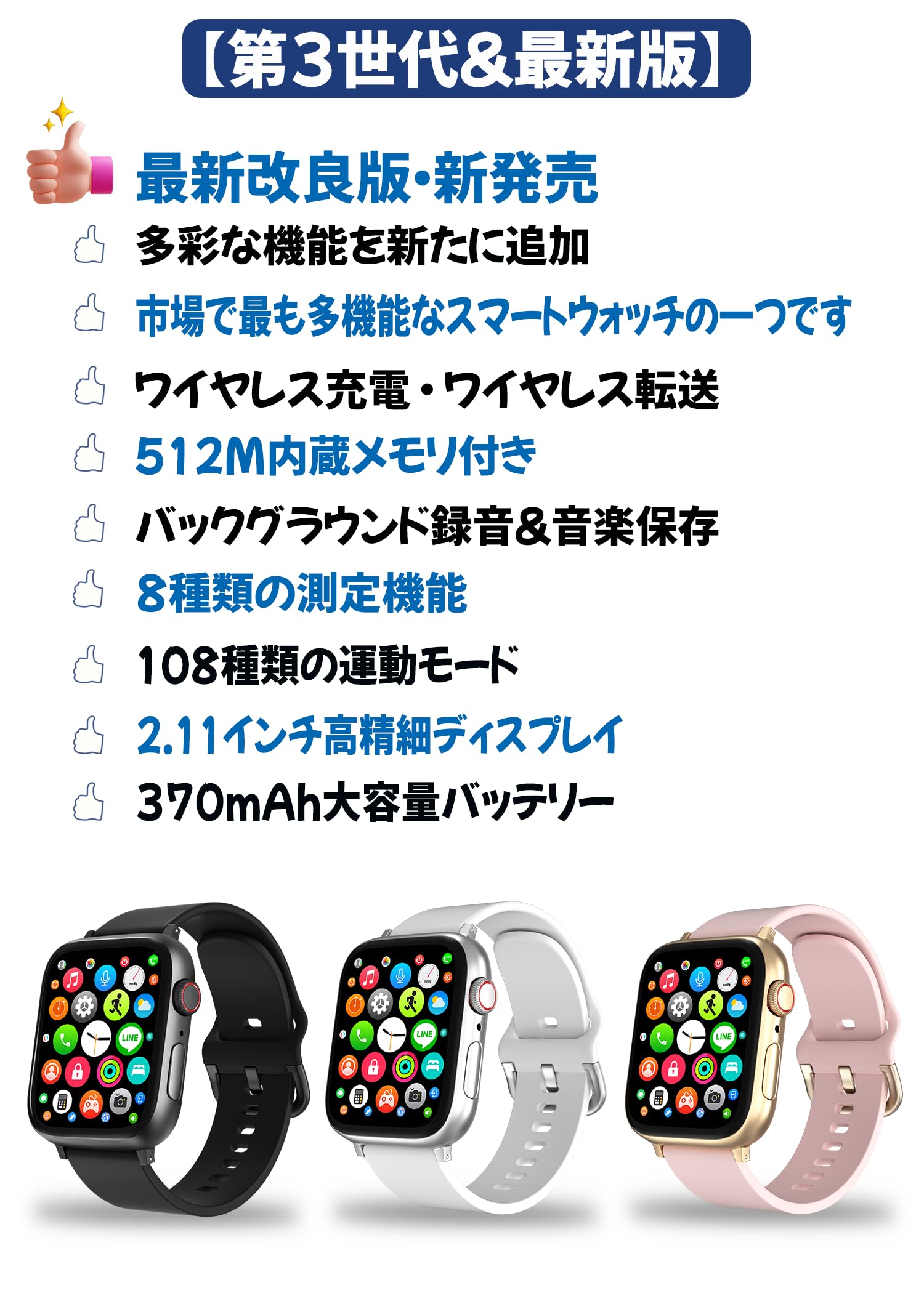* 【豊富な機能】512MBメモリ搭載、録音機能付き(バックグラウンド録音が可能)、Bluetooth通話機能付き、SOS緊急連絡、8種類の測定機能、音楽保存機能付き、3種類の音楽再生モード (ローカル音楽、スマホ音楽モード、Bluetoothヘッドセットモード)、AIチャット、コンパス 、懐中電灯、アルバム、音声アシスタント、ミニゲーム、電卓機能付き、電子書籍、カレンダー、GPS位置情報、歩数計、タイマー、ストップウォッチ、アクティビティ記録、108種類の運動モード 、アラーム、スケジュール管理、生理周期管理、睡眠管理、騒音レベル測定、スマホ探し、天気予報、Line/Gmail/SMSメッセージ通知 、SNS用QRコード 、QRコード決済、翻訳、リモートカメラ、健康リマインダー(服薬リマインダー、水を飲むリマインダー、座りすぎ通知)、文字盤をカスタマイズ。