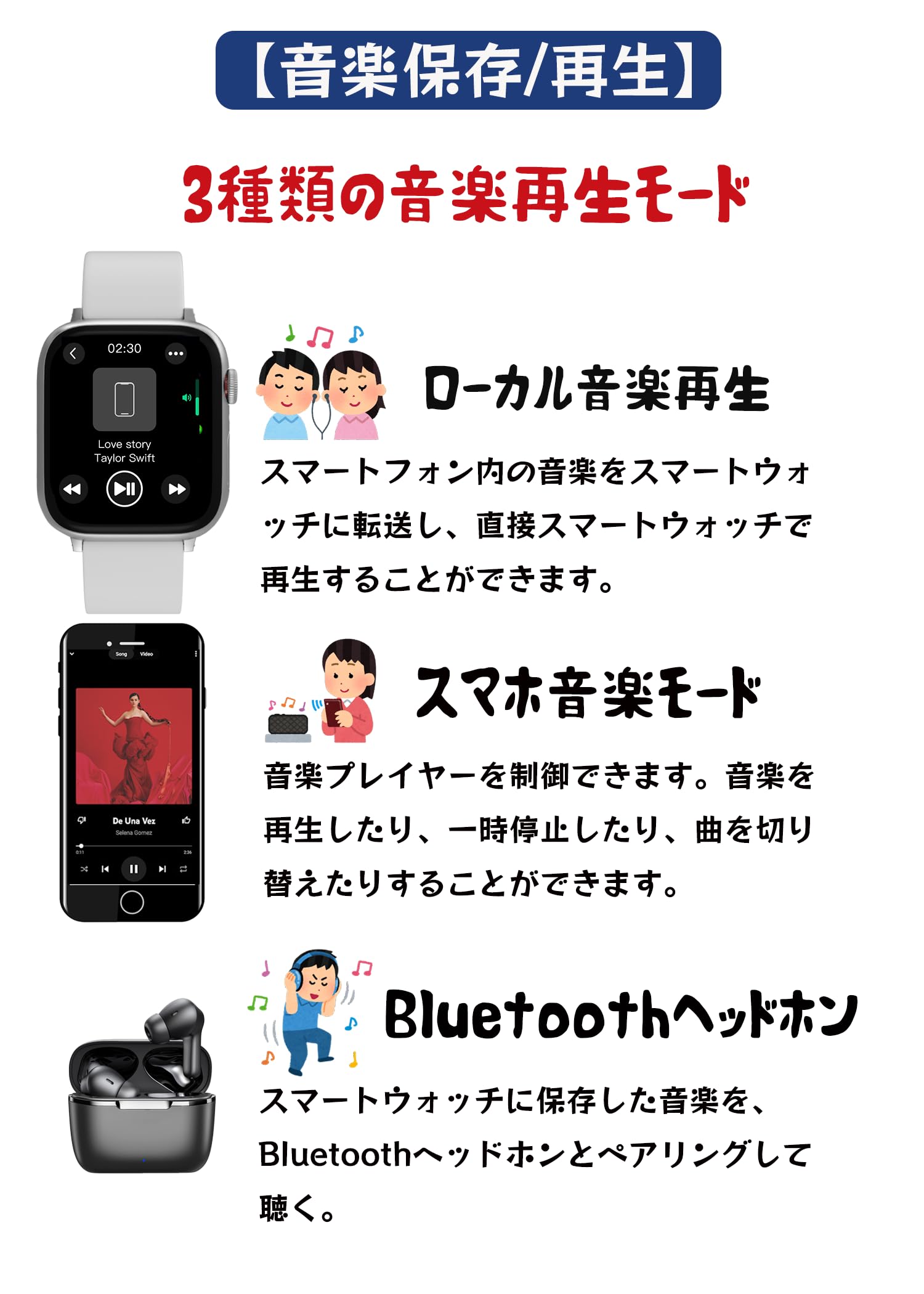 * 【ワイヤレスデータ転送技術】本スマートウォッチは、アップグレードされた第2世代モデルです。第2世代では、ワイヤレス充電に加え、ワイヤレスデータ転送技術にも対応しました。スマートフォンとBluetoothで接続するだけで、ケーブルを使用せずにデータのやり取りが可能です。スマートフォンからスマートウォッチへ音楽を転送したり、スマートウォッチからスマートフォンへ録音データを転送したりすることができます。