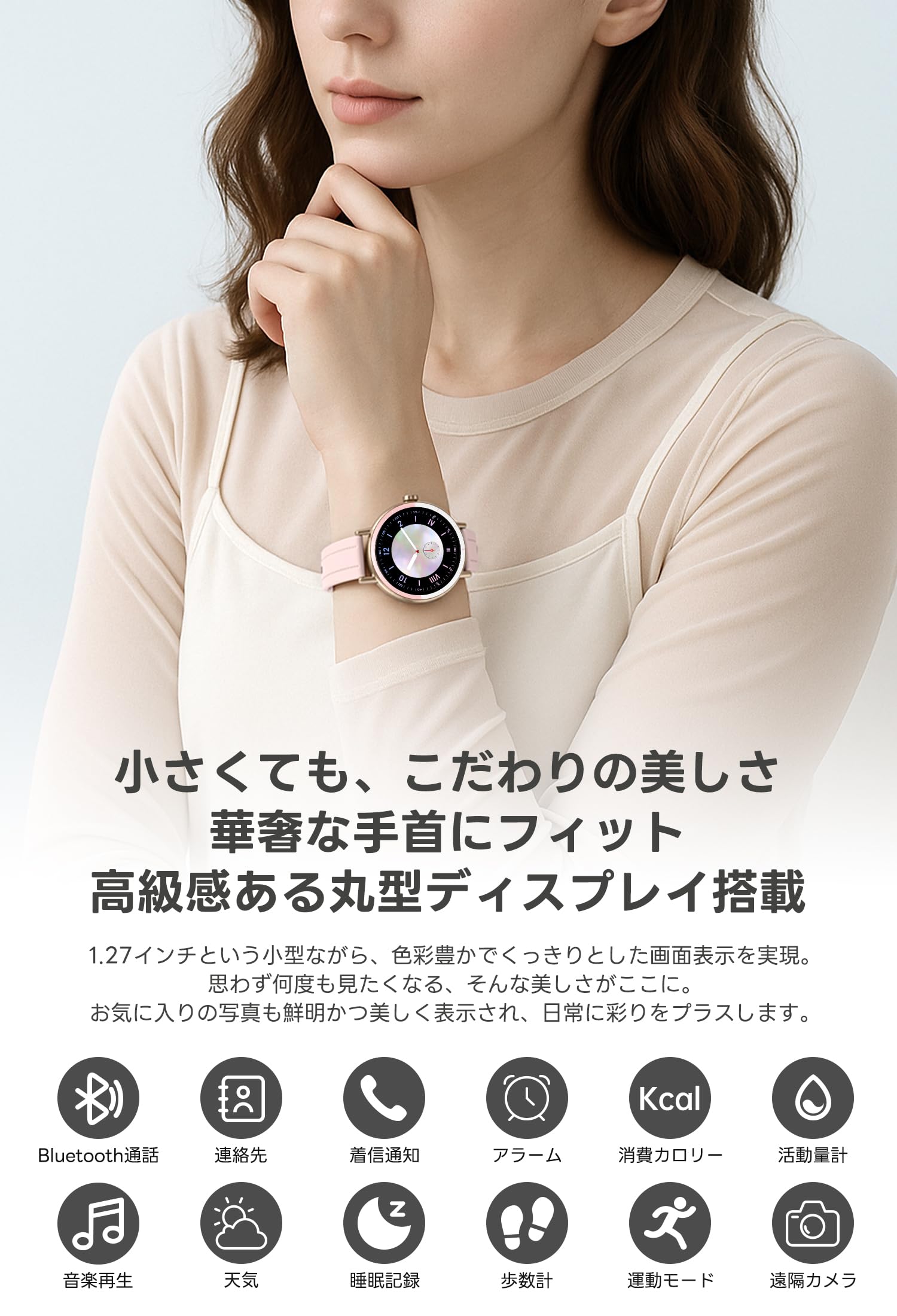 スマートウォッチ レディース 小さめ iPhone対応&アンドロイド対応 1.27インチSmart Watch 薄型軽量 Bluetooth通話機能 SMS/Line通知 多種類ファッション文字盤 丸型 スマートウォッチ ベルト幅18mm 常時表示 活動量計 様々な種類運動モード IP68生活防水 メッセージ通知 腕時計 天気予報 音楽再生 プレゼント