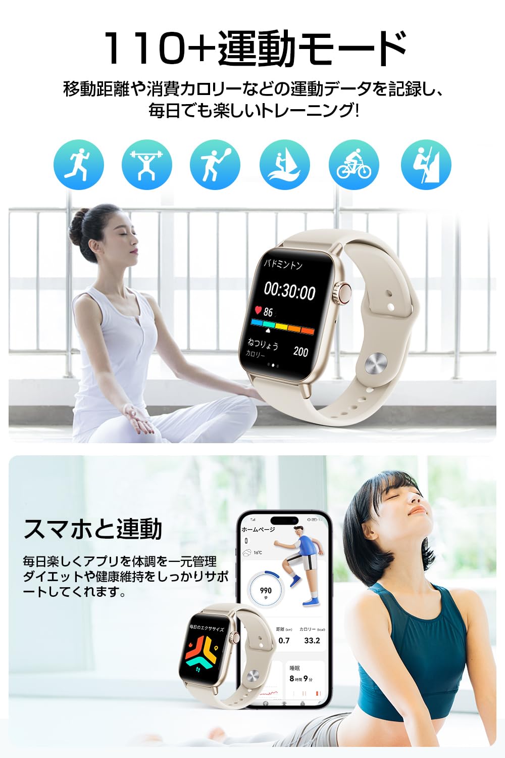 * 【多端末同期 プロ級の運動サポート】 内蔵の110種類の運動モードは、ランニング、サイクリング、水泳、ヨガなど多様なトレーニングに対応の上、各種運動の状況を正確に把握し、日常的な活動から本格的なトレーニングまで、詳細なデータレポートを提供します。専用アプリを併用することで、AndroidとiOS(iPhone)を問わず簡単に情報やデータを同期可能、運動効果を科学的に高め、健康管理の効率化を図り、より自律的で質の高いライフスタイルを実現できます。
