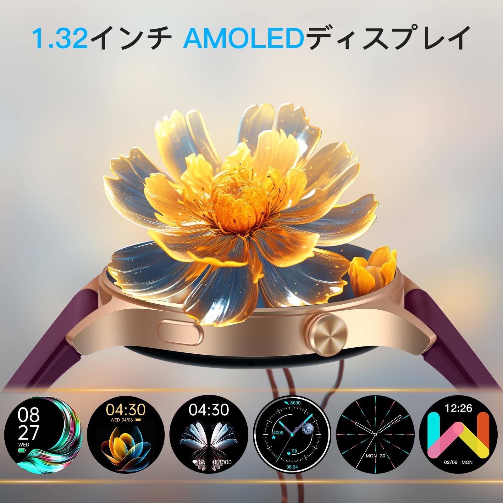スマートウォッチ 丸型 iPhone対応 アンドロイド対応,Line アプリ通知 2025新型,1.32インチAMOLEDディスプレイ 睡眠管理 BPM SP02 100+種類運動モード 12日長持ち 円型腕時計,IP68防水 常時表示 天気予報 160+文字盤 リモートカメラ 懐中電灯