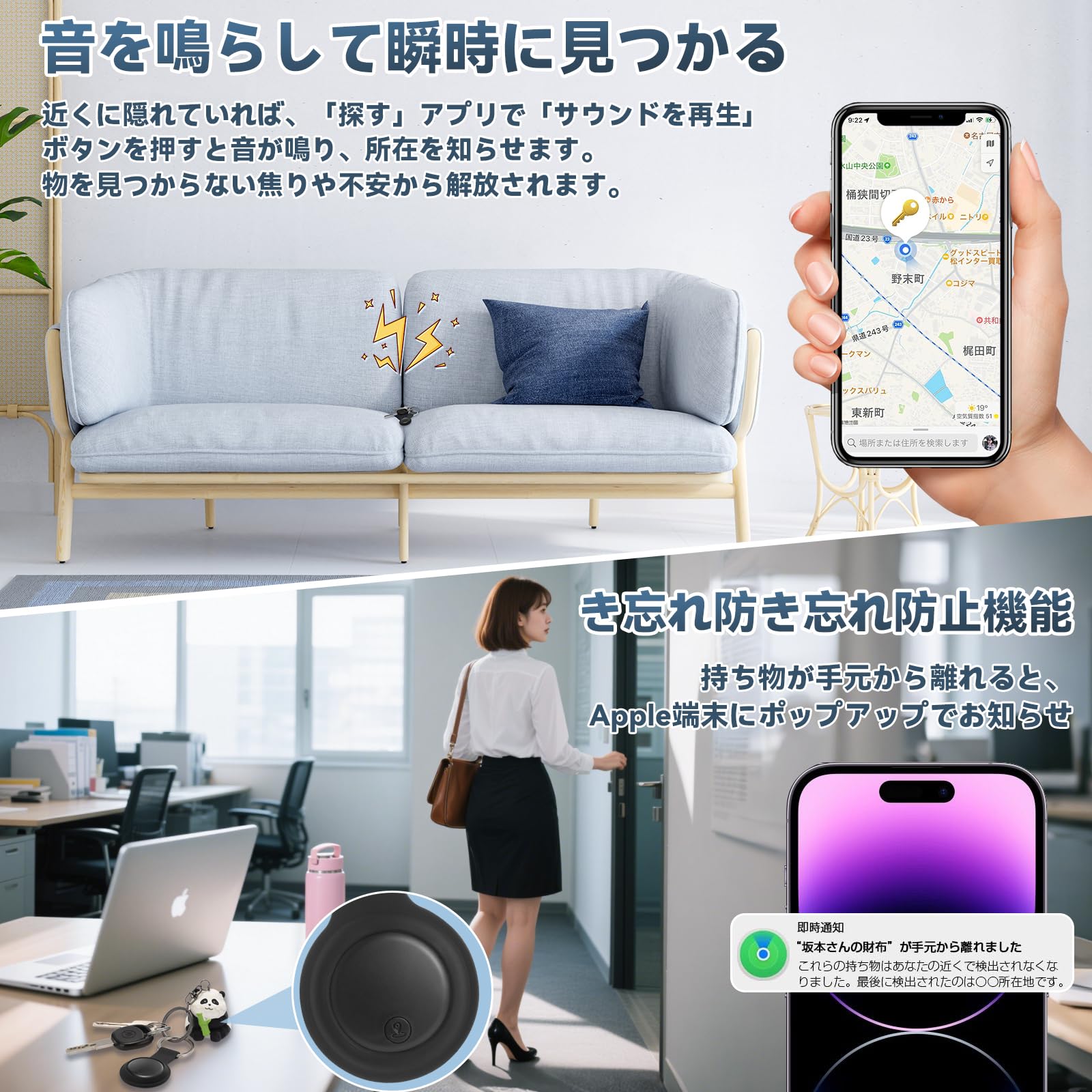 * 【紛失防止モード】iPhone、iPad、Macデバイスの「探す」ネットワークを利用して、物の位置情報を特定できます。他のアプリをダウンロードする必要がありません。最先端の追跡技術を使用し、正確でリアルタイムな位置情報を提供します。また、デバイスと紛失防止タグが成功にペアリングされた場合、特定の距離を離れると、システムは自動的にスマホに「デバイスが手元から離れました」という通知を送信し、前回検出されたときの紛失防止タグの位置を教えます。この機能を使用すると、物を忘れたことことをタイムリーに注意し、忘れ物を見つけるのに役立ちます。落とし物、紛失防止、盗難防止に大変役立ちます。計なので、財布やカバン、キー、ペットの首輪などに簡単に取り付けられます。(注意:最近、Appleのシステム更新により、MFI製品が接続できない場合があります。お客様はお手持ちのiPhoneを最新のシステムに更新していただければ、正常に接続できるようになります。)