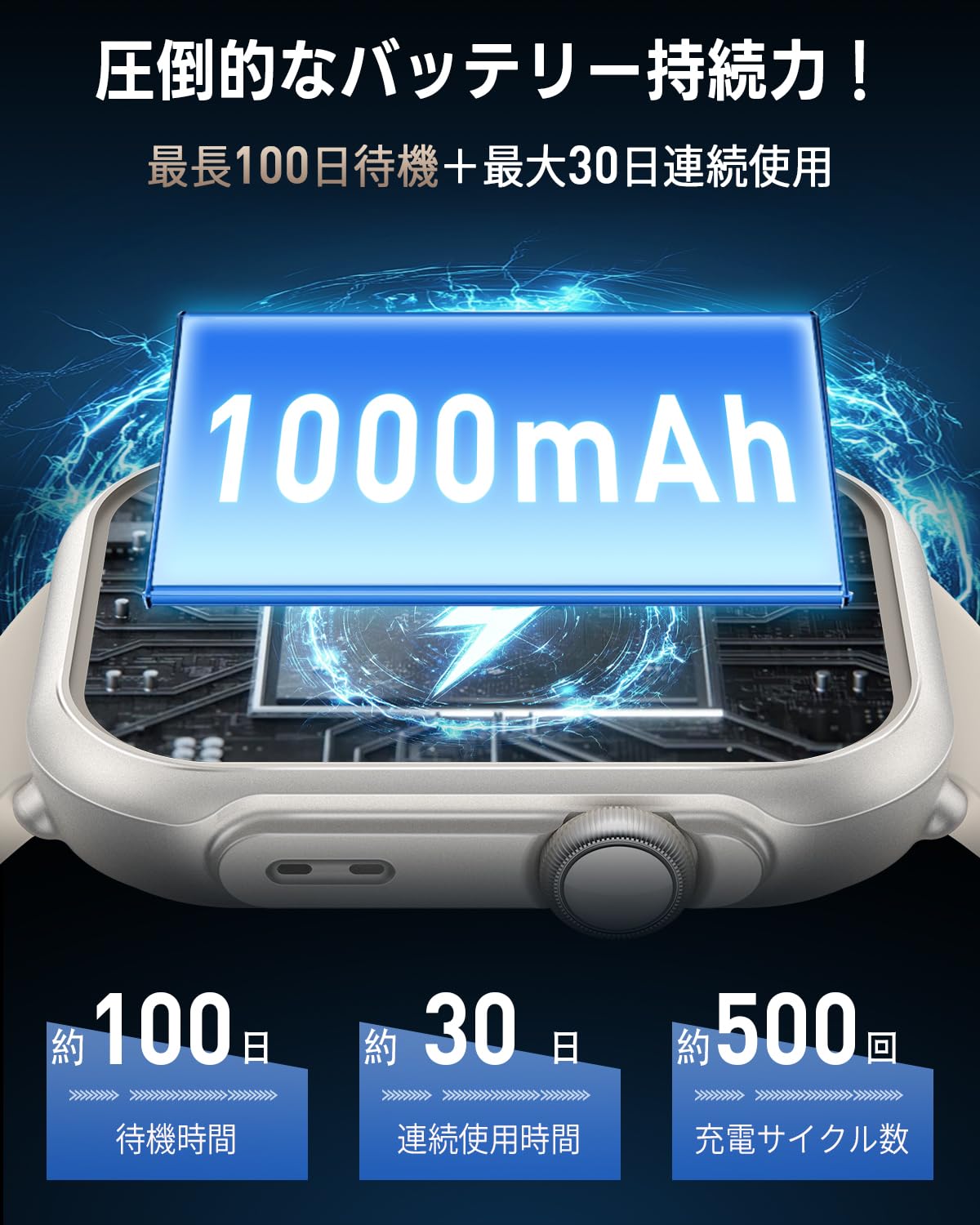 * 【大容量1000mAhバッテリー搭載・最大30日間連続使用可能】本スマートウォッチは、1000mAhの大容量バッテリーを搭載し、フル充電で最大30日間の連続使用が可能です。待機時間は約100日と、頻繁な充電の手間を大幅に軽減します。市販のスマートウォッチと比較しても優れたバッテリー持続力を誇ります。また、音声アシスタント、スマホを探す、天気表示、画面の明るさ調整、懐中電灯、アラーム/タイマー/ストップウォッチ、遠隔カメラ操作、音楽コントロール、名刺表示など、日常生活を快適にサポートする便利な機能を多数搭載しています。