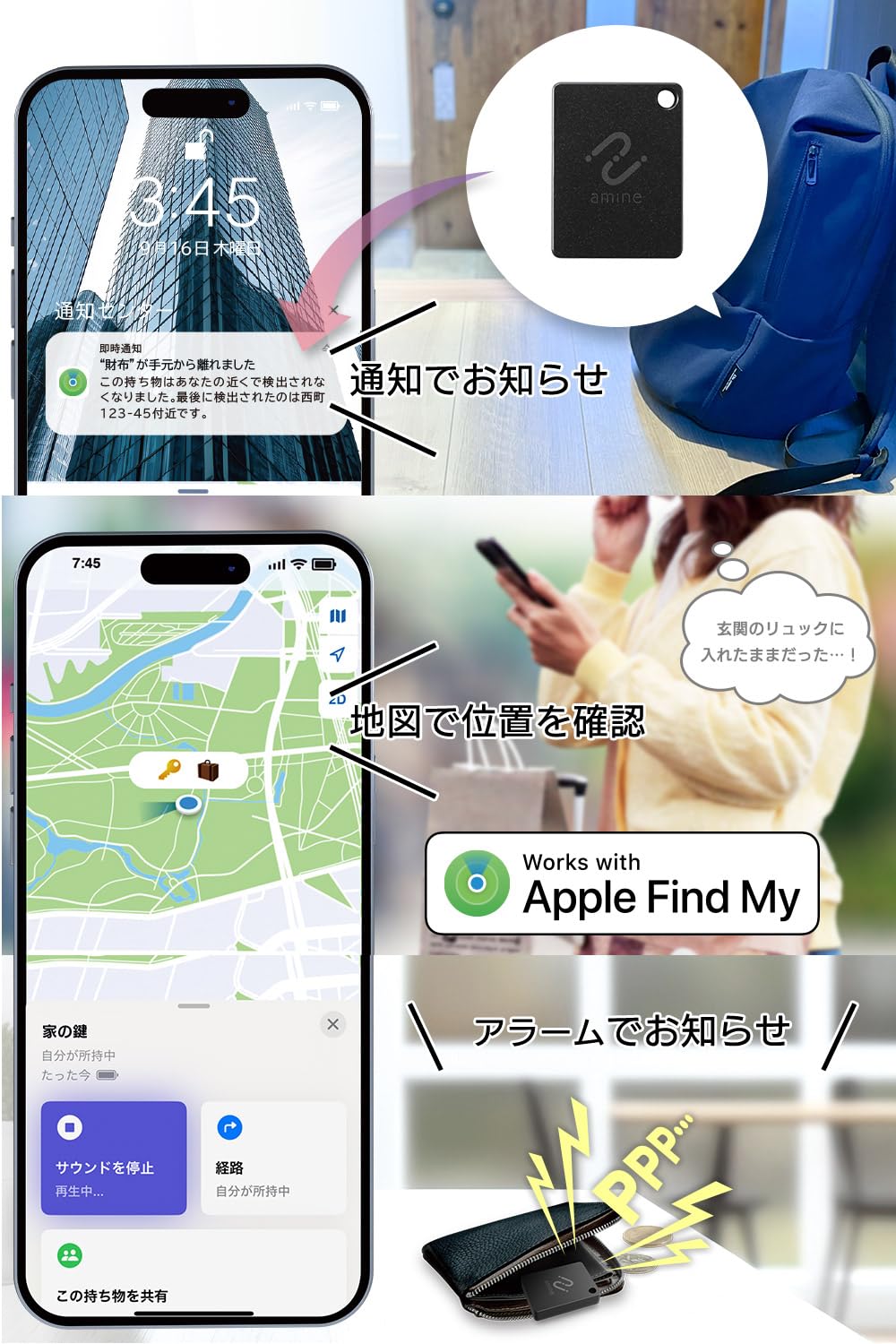 * 【置き忘れや紛失した時に通知でお知らせ】スマートトラッカーがスマホのBluetooth接続範囲を離れるとアプリ「探す」から通知が届きます。アプリの地図で位置を確認しながら、置き忘れや紛失した持ち物の場所を特定します。