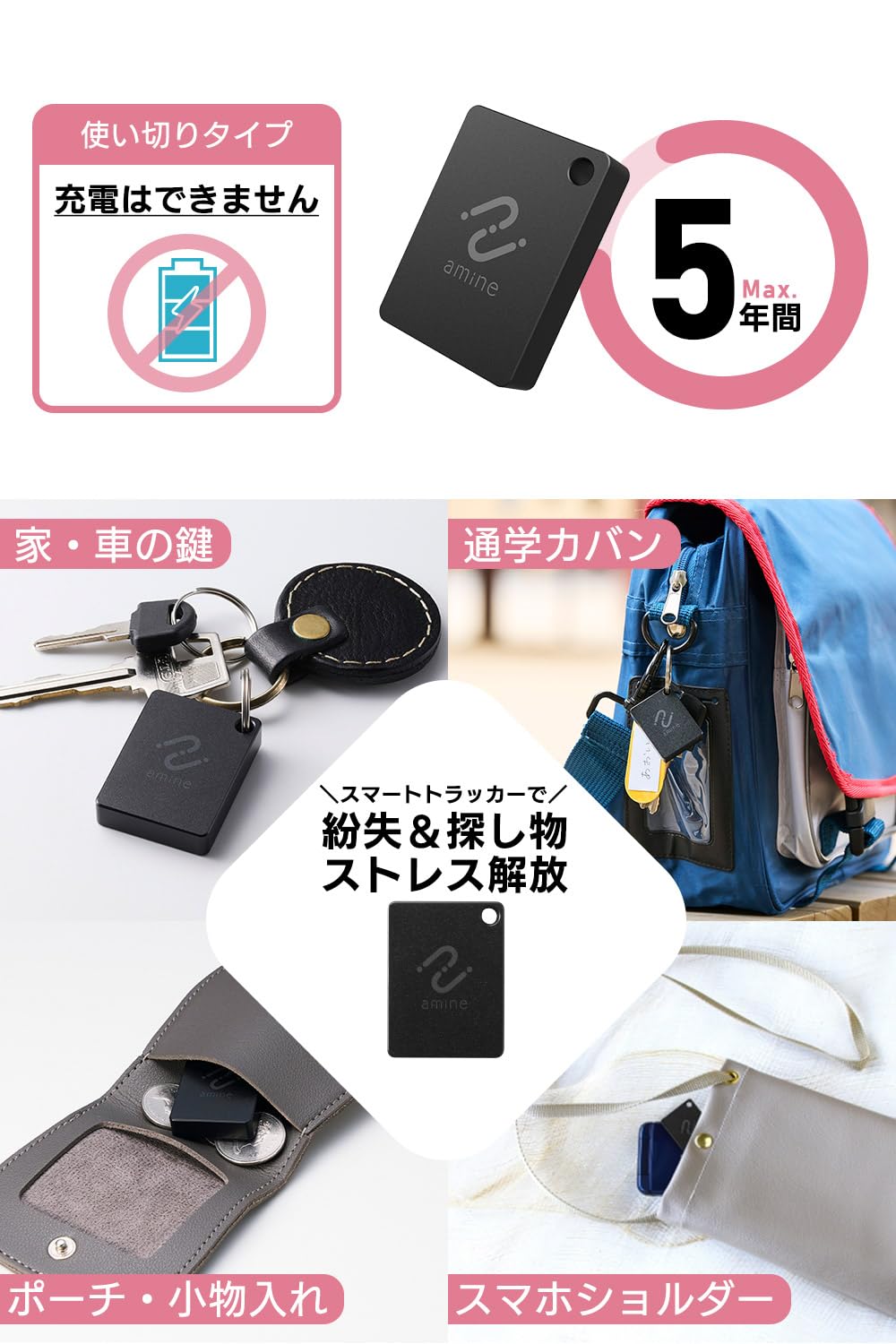 * 【充電せず5年間使える】充電や電池交換がいらない使い切りタイプ。長寿命設計で、財布やパスケースなどに入れたままの状態で最大5年間使うことができます。 ※バッテリーの稼働時間は接続状態での最大値です。音を頻繁に鳴らすなどご利用方法によっては稼働時間が短くなります。
