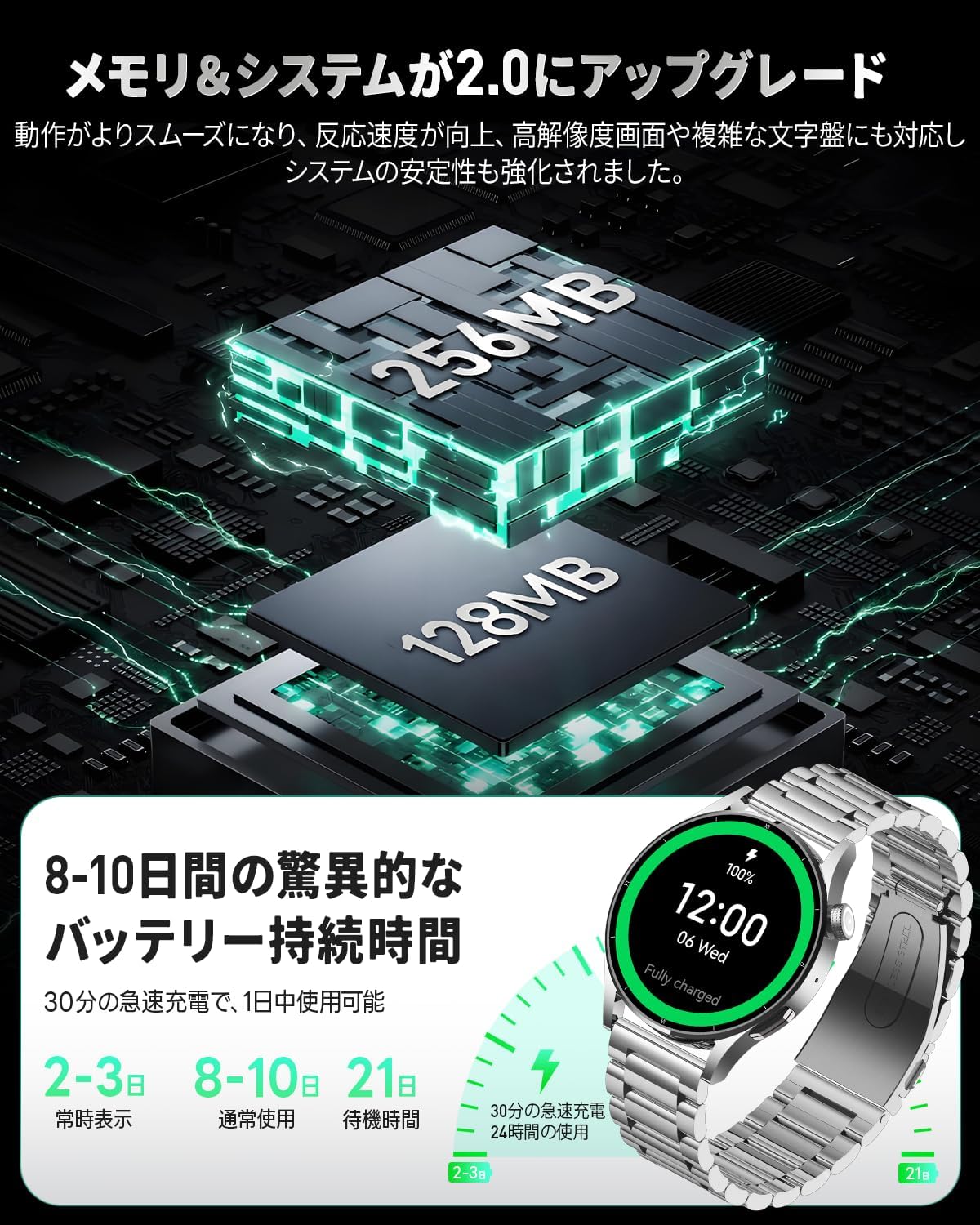 * 【Bluetooth通話&通知対応、超大容量バッテリー搭載】2025年最新のスマートウォッチ 丸型 メンズは、腕を上げるだけでLINEやTwitterなどのメッセージ確認やハンズフリー通話が可能。約30分の急速充電で1日分の使用ができ、フル充電(約2時間)で8〜10日間の連続使用、2〜3日間の常時表示、最大21日間の待機時間を実現。ワークアウトやBluetooth通話も安心して楽しめる圧倒的スタミナが魅力です。