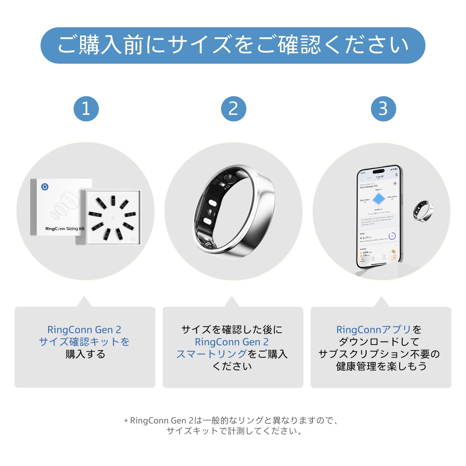 * 【購入前にサイズ確認】RingConn Gen 2スマートリングは他社の健康リングとは異なる独自のサイズ基準を採用しています。RingConn Gen 2サイズキットを使用することで、指に最も快適で正確なフィット感を見つけられ、購入前に正しいサイズを選択することで返品や交換の手間を防ぎます