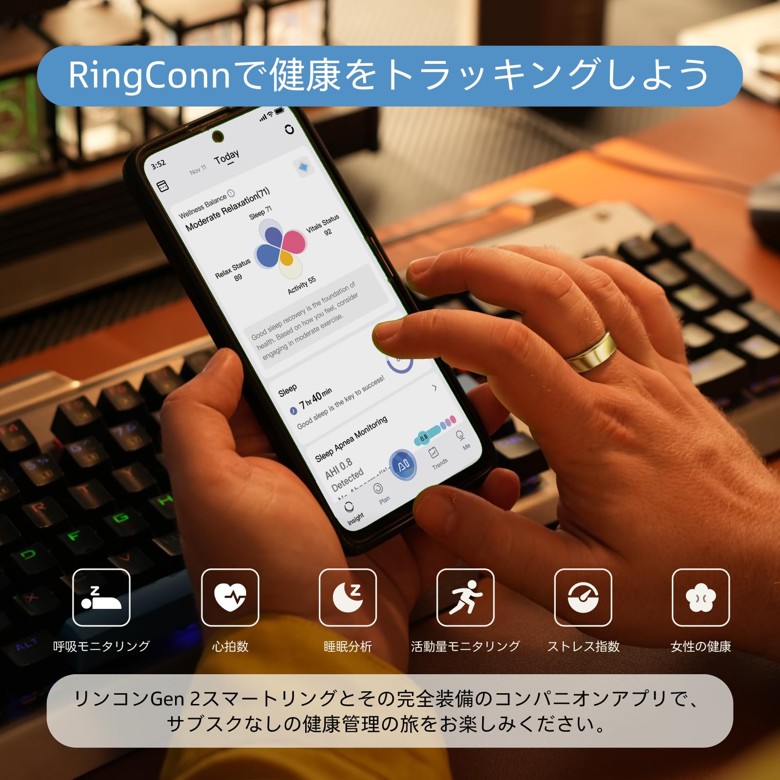 * 【サブスクリプション不要】RingConn Gen 2スマートリングをご購入いただくと、RingConnスマートヘルスモニタリングアプリの包括的な機能に永久アクセス可能。継続的でリアルタイムな健康トラッキングとパーソナライズされた分析を体験できます