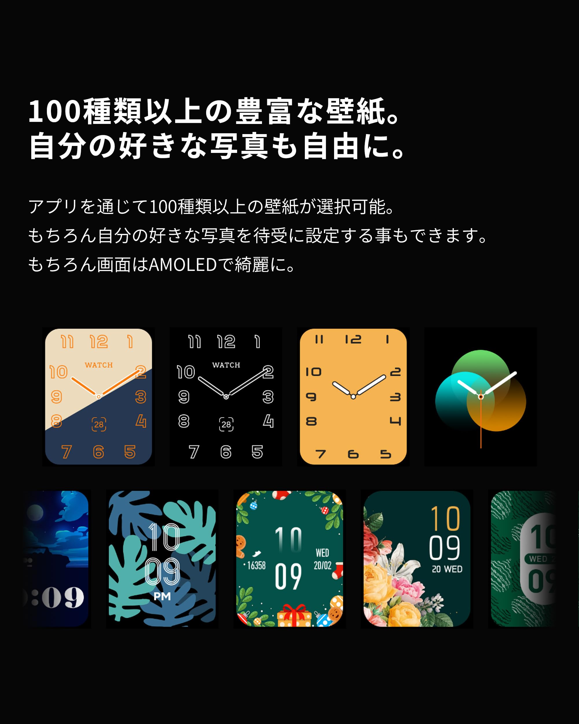 * 【常時表示AMOLEDディスプレイ。どんな時でもサッと時間を確認】常時表示機能が搭載になりました。常時表示の表示方法は2つ、アナログとデジタル表示。アナログデザインが好きな方はアナログを、正確な分数まで確認したい方はデジタルを。常時表示にしたい時間帯も設定可能になりました。日中は常時表示をオンにすることでどの体勢からもですぐに時間が可能に。夜中は表示をオフにすることで穏やかな睡眠を。常時表示機能を搭載するだけではなく、その先の用途に拘りました。ディスプレイはハイランクのスマートウォッチに搭載されているAMOLEDディスプレイ。画面をずっと見ていたくなる感覚。お気に入りの写真を待ち受けにして楽しもう。