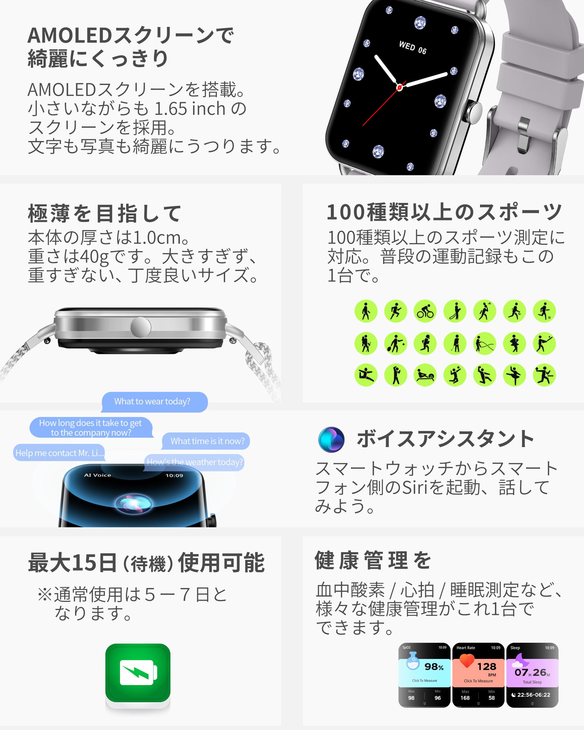 * 【主要機能】「メッセージ/着信通知(対応済みアプリ:LINE/着信/SMS/Facebook/X(Twitter)/Instagram/WhatsApp/WeChat/Skype/KaKaoTalk/QQ」「AMOLED常時表示ディスプレイ」「メッセージ/着信通知」「通話」「連絡先保存」「音声アシスタント」「ステップ数」「消費カロリー」「睡眠記録」「スポーツ測定」「天気予報」「音楽操作」「生理周期管理」「遠隔撮影」「ストップウォッチ」「タイマー」「アラーム」「計算機」「腕振り点灯」「スマートフォンを探す」「呼吸エクササイズ(リラックス)」「壁紙変更」「明るさ調整」「世界時計」「座りがち通知」他