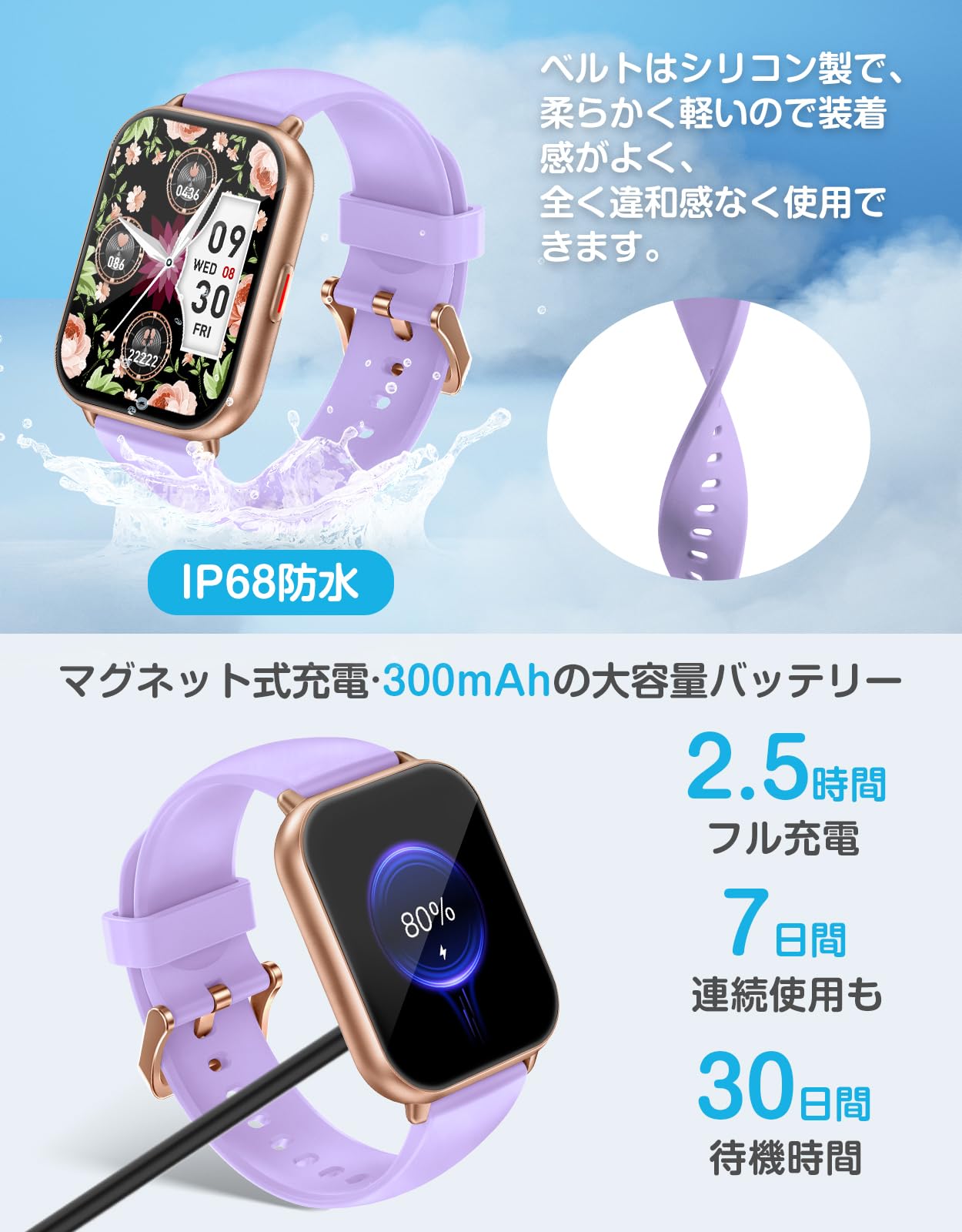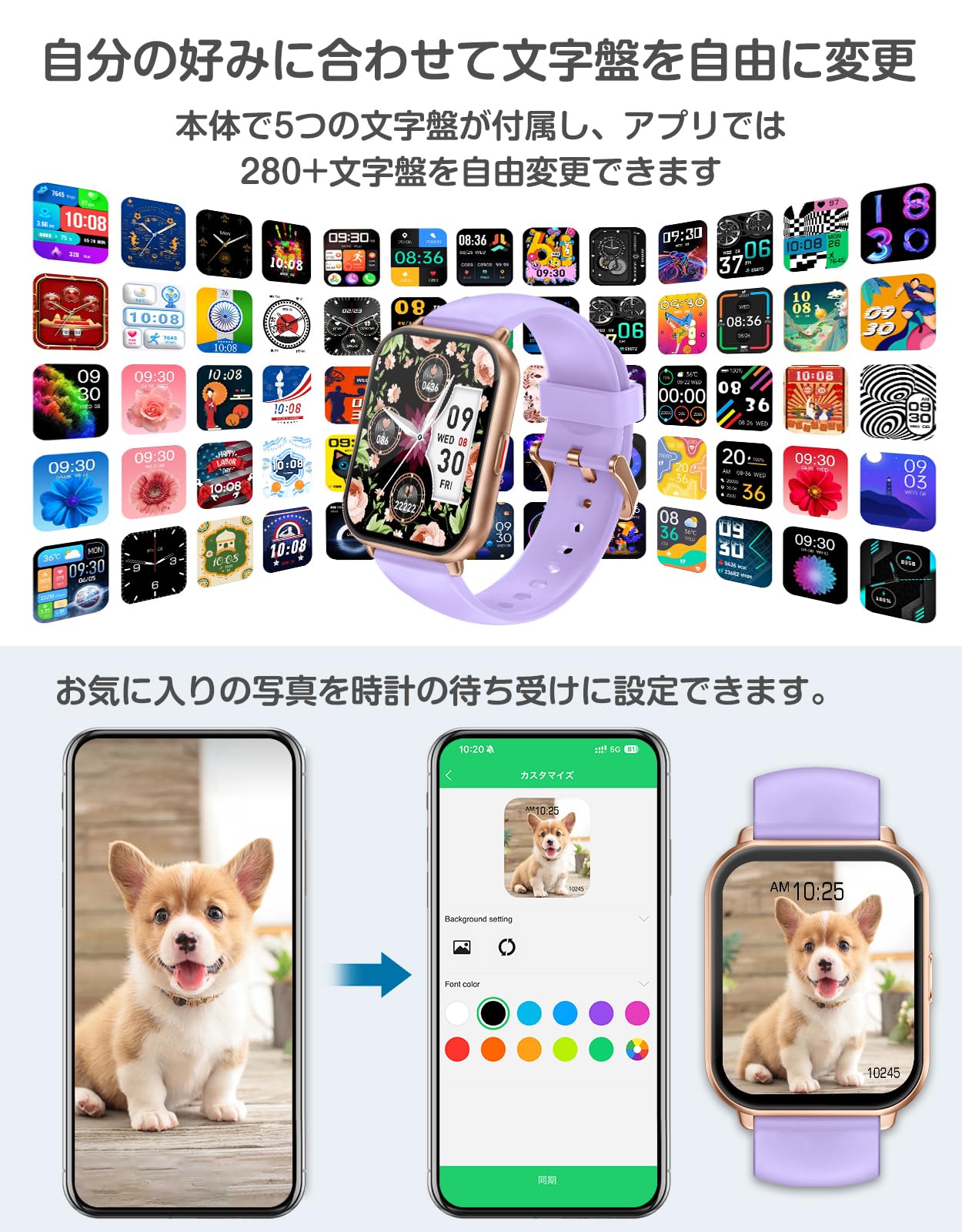 * 【カスタマイズ文字盤・豊富な機能を搭載】 280種類以上の文字盤デザイン——クラシック、シンプル、クール、かわいいものが揃っています。気分や服装に合わせて時計の文字盤を変えることができ、1日に新鮮さと活力を与えてくれます。このほかオリジナルダイヤルを指定でき、ペットや家族など好きな画像をダイヤルに設定できます。毎日を幸せにします。ストップウォッチ、タイマー、懐中電灯、音楽コントロール、目覚まし時計、座りがちリマインダー、女性の月経周期記録、腕上げ点灯、スマホを探す、明るさ調整など毎日のニーズに応える機能が充実しています。