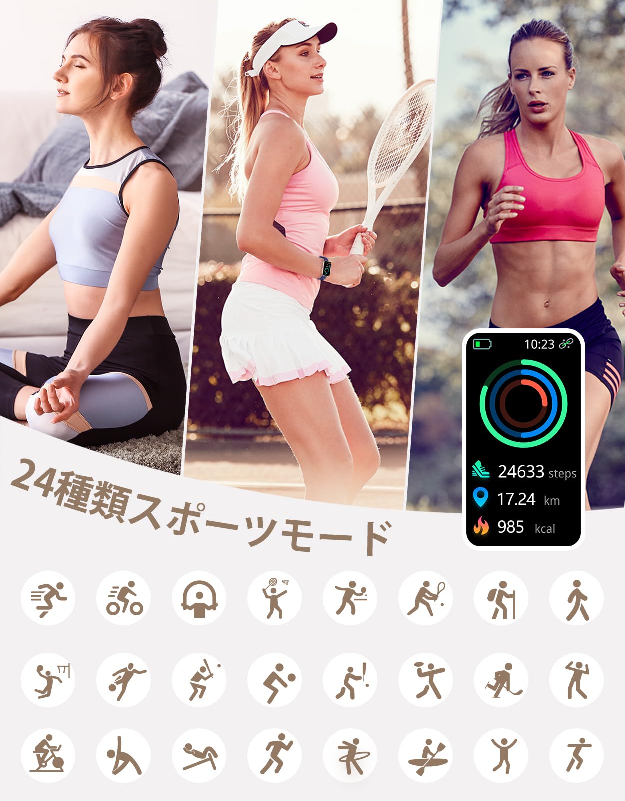* 「24種類の運動モード·IP68防水」スマートウォッチL2には24種類の運動モードがあります。ランニング、ウォーキング、登山、ヨガなど、あらゆる種類の運動に対応しています。運動中にこのウォッチを身につけて、自分自身のフィットネスレベルを向上させましょう!さらに、このウォッチはIP68の防水機能を備えており、普段は手や顔を洗うときに外す必要はありません。しかし、海水、プール、お風呂、サウナ、温泉などの熱い水中では使用できません。これらの環境下で使用すると、ウォッチが損傷する可能性があります。使用する際には、この点にご注意ください。