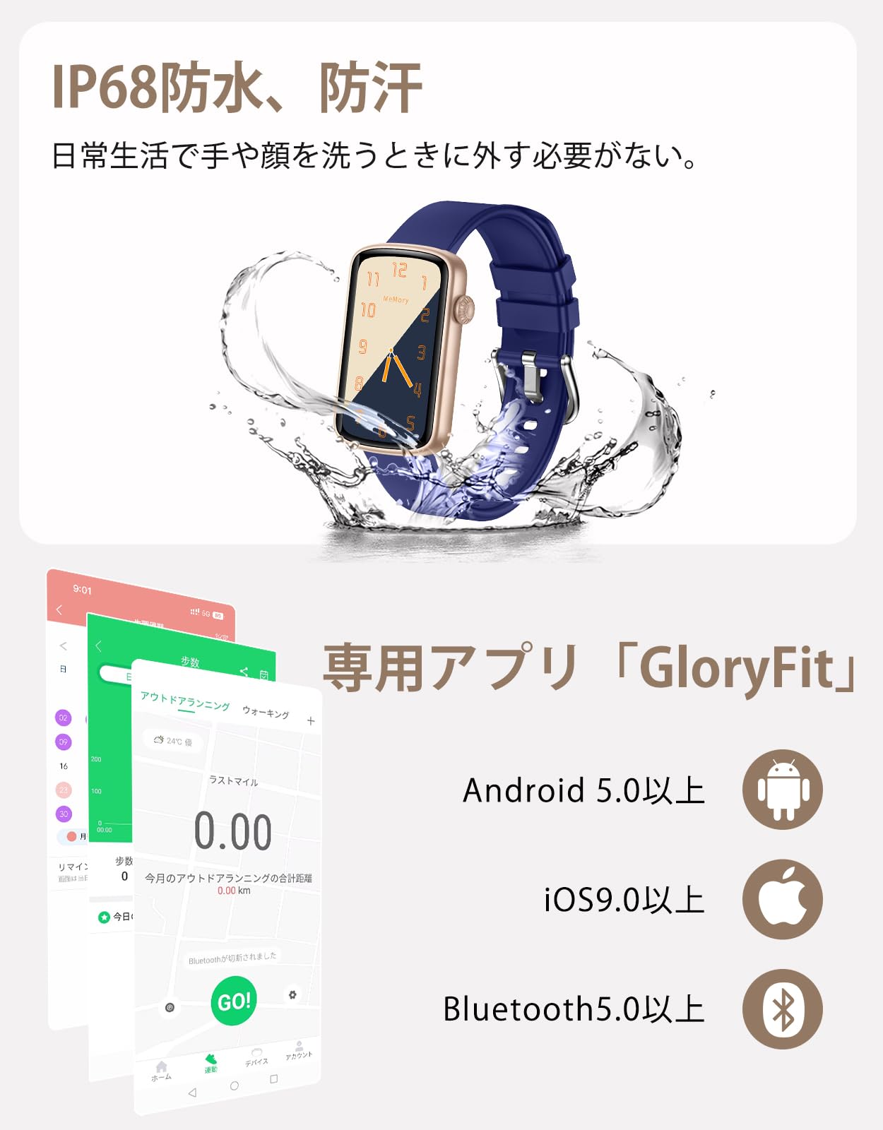* 「着信通知機能付き」着信通知機能をサポートしています。電話がかかってきた場合、名前を確認することができ、必要に応じて電話を切断することができます(通話機能はありません)。また、Line、Facebook、Messager、Twitter、Whatsapp、Skype、Linkedin、Instagram、Viber、Gmailなど、多彩なメッセージアプリの通知をサポートしています。手元のスマートウォッチで通知を確認することで、いつでも大切な情報を手軽に確認できます。例えば、会議中や授業中、スマートフォンを取り出すことができなくても、手元のスマートウォッチでメッセージ通知を確認することができます。
