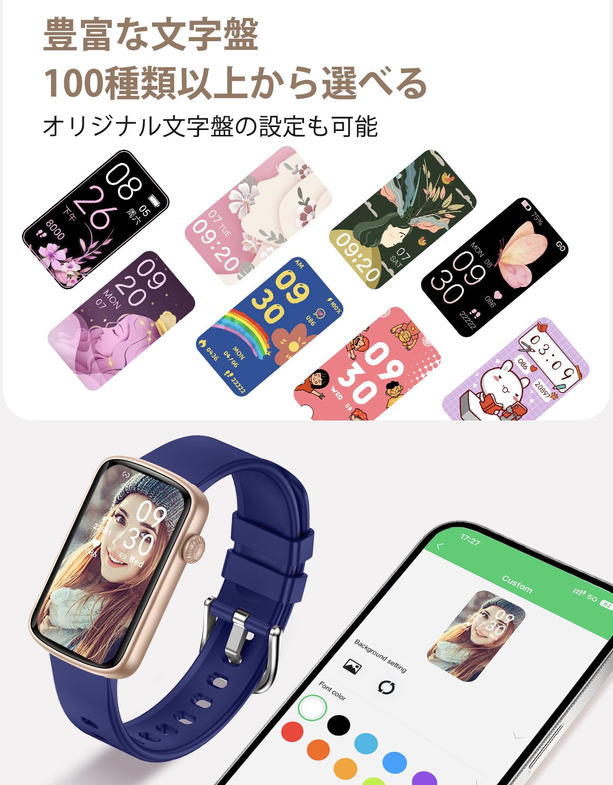 * 「100+文字盤·座りすぎ通知·生理周期」スマートウォッチ本体に5つの文字盤を搭載。専用アプリで100以上の文字盤をダウンロードできるだけでなく、アルバムや撮影により、お気に入りの写真を文字盤に設定することもでき、毎日気分に合わせたスタイルを楽しめます!専用アプリで座り過ぎのリマインダーの時間帯や間隔を自由に設定し、日常生活に無理なく取り入れられます。体を動かすタイミングを見逃しません。さらに、女性の生理周期を記録する機能では、アプリで生理周期の開始日と終了日を記録することで、次回の予想月経日や排卵日などを予測することができます。