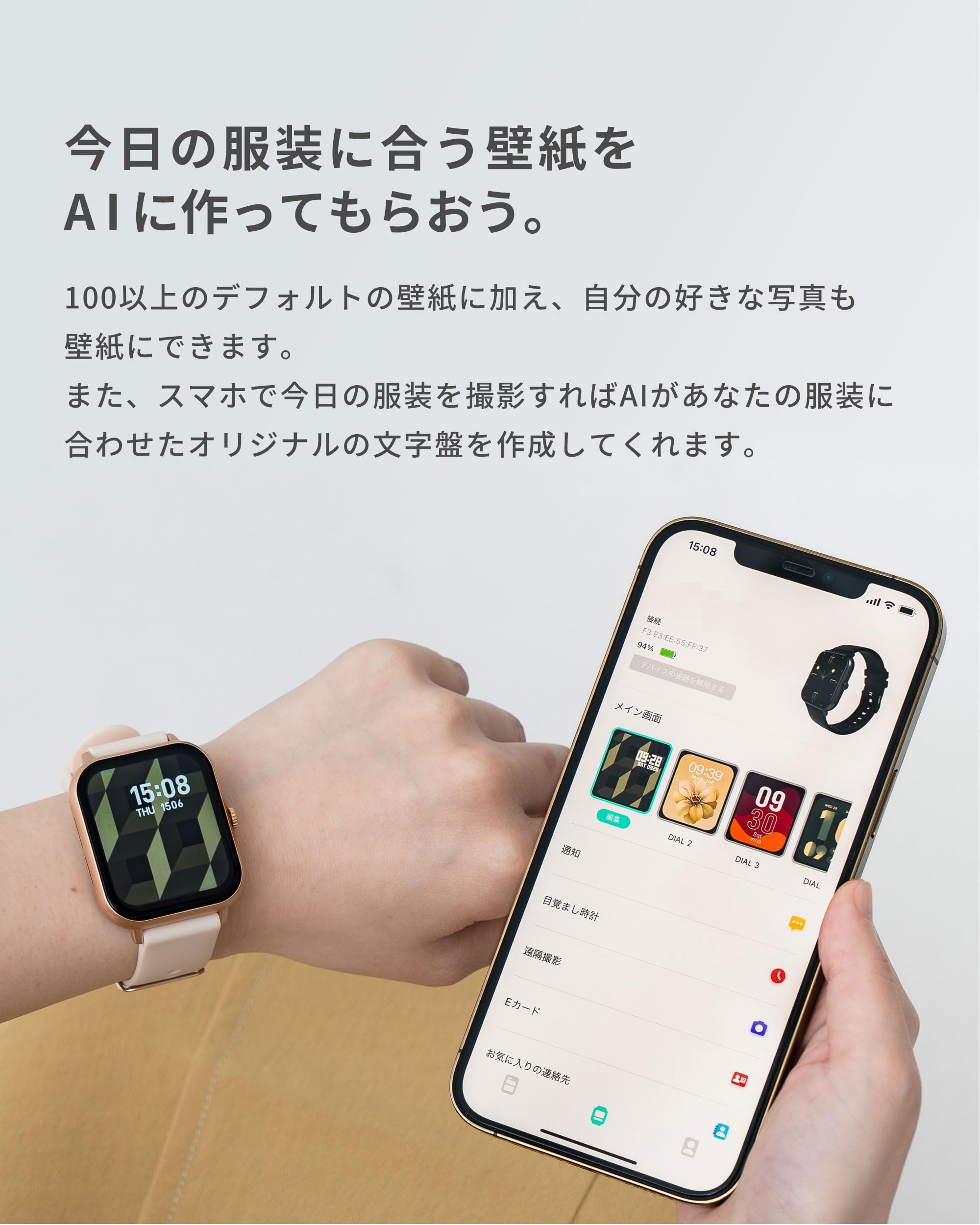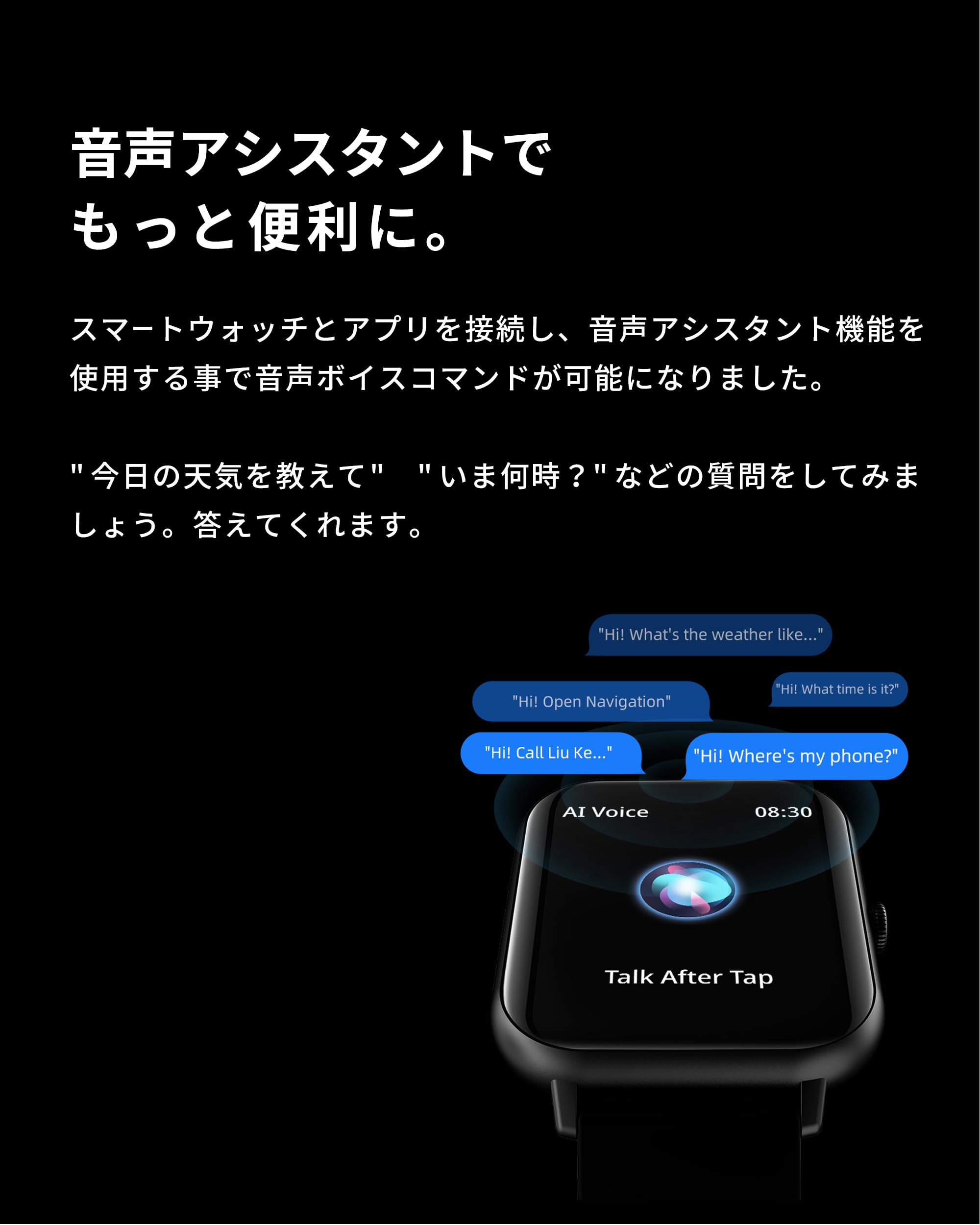 * 【今日の服装に合う壁紙をAIに作ってもらおう】100以上のデフォルトの壁紙に加え、自分の好きな写真も壁紙にできます。また、スマホで今日の服装を撮影すればAIがあなたの服装に合わせたオリジナルの文字盤を作成してくれます。弊社インスタグラムで配布中のオリジナル壁紙もQRコードでダウンロードが可能画面サイズは1.83インチ。画面の操作性に優れています。運動時や散歩中、ちょっとした時に簡単に画面にアクセス、メッセージの確認もしやすくなりました。