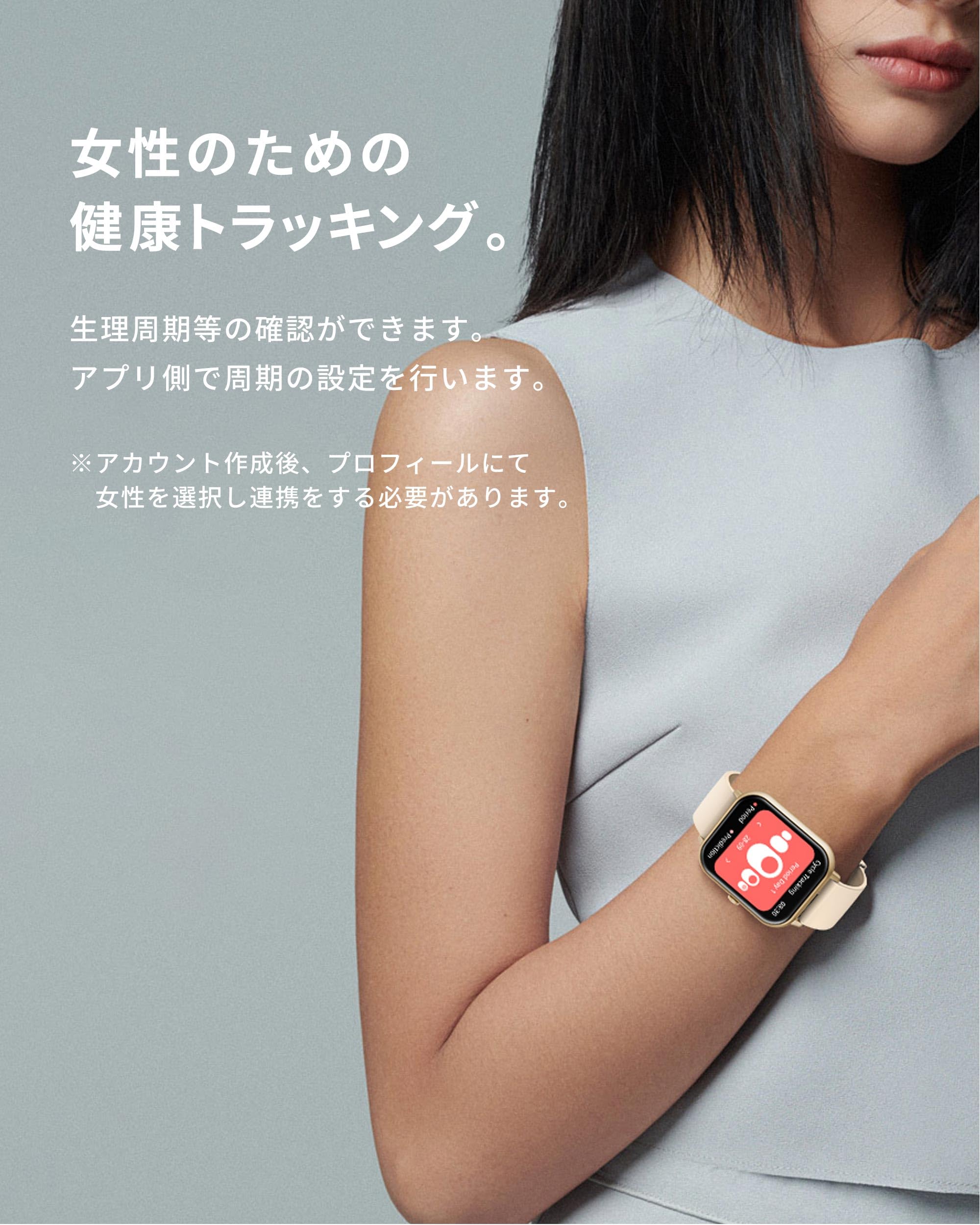 * 【主要機能】「メッセージ/着信通知」「通話」「連絡先保存」「音声アシスタント」「ステップ数」「消費カロリー」「睡眠記録」「エクササイズ」「天気予報」「音楽制御」「生理周期管理」「ストップウォッチ」「タイマー」「アラーム」「計算機」「腕振り点灯」「スマートフォンを探す」「スマートウォッチを探す」「呼吸エクササイズ」「壁紙変更」「明るさ調整」「スタンドリマインダー」「遠隔撮影」「飲水通知」