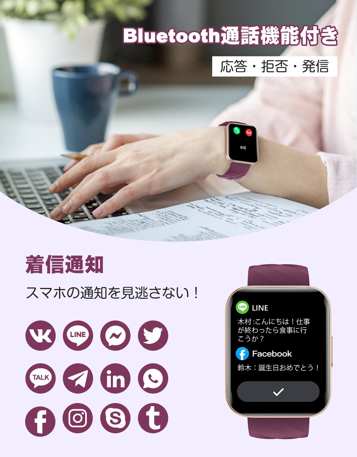 * 【活動量計&日常生活管理&IP68級の防水】日常生活や様々なスポーツ、フィットネス活動において、スマートウォッチの革新モデルは歩数、距離など様々なスポーツデータを記録することができます。ランニング、ウォーキング、サッカー、水泳、ヨガなど、アプリには100種類以上の運動モードがあり、多様な運動ニーズに応え、運動管理をサポートします!スマートウォッチは手首に装着することができ、軽量設計と通気性の良いベルドにより、一日中装着していても負担なく身体の状態を把握することができます。、女性のニーズに合わせて生理周期の機能も搭載しています。日常生活に大きな利便性をもたらし、幸福感をもたらす!IP68の防水性を備えているので、日常生活の手洗いや洗顔の際はもちろん、夏に汗だくのトレーニングにも気にせずに使用OK です。※ご注意:お風呂、サウナ、温泉水や温泉の湯気及び高い水圧は故障の原因となります。