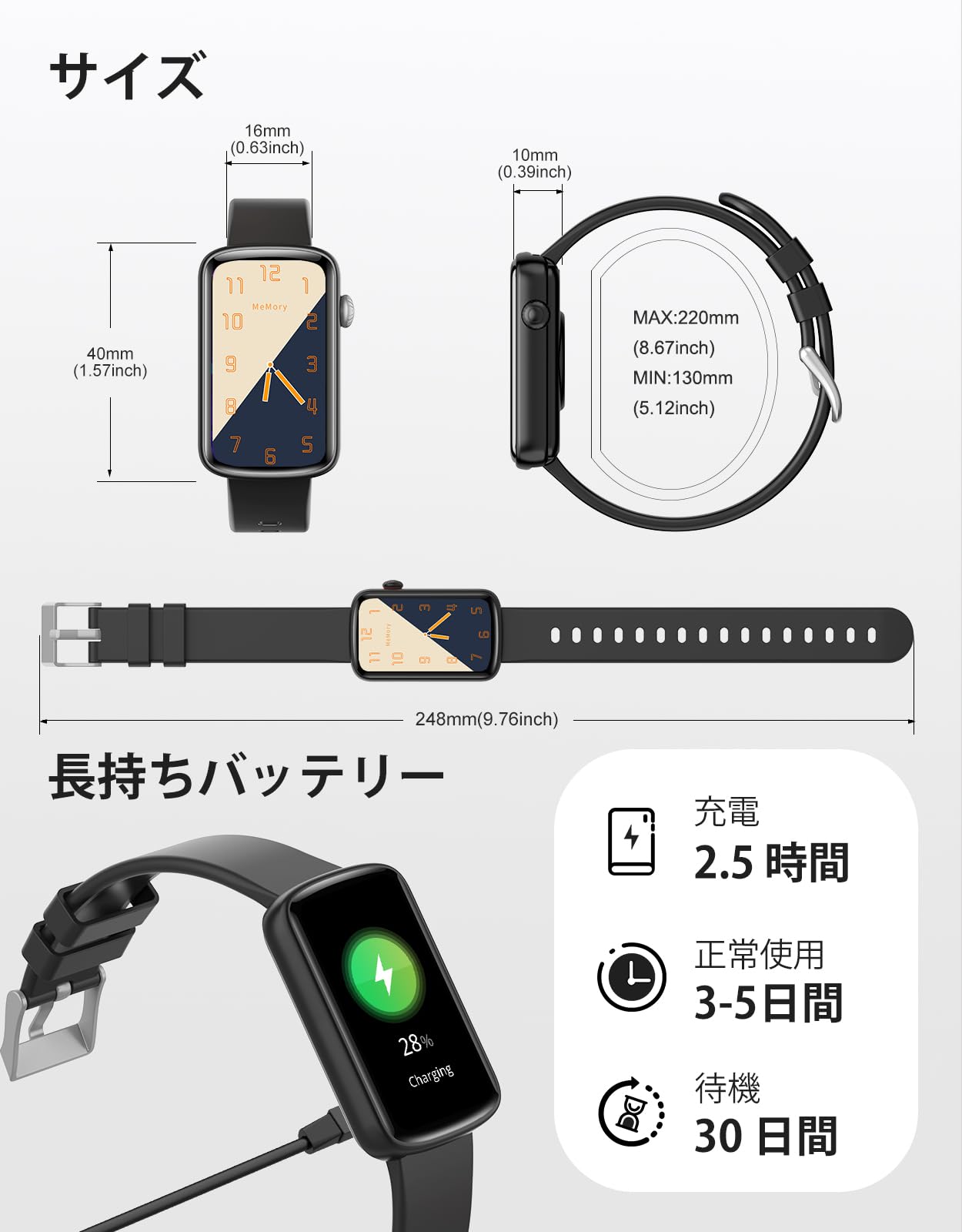 * 「100+文字盤·座りすぎ通知·生理周期」スマートウォッチ本体に5つの文字盤を搭載。専用アプリで100以上の文字盤をダウンロードできるだけでなく、アルバムや撮影により、お気に入りの写真を文字盤に設定することもでき、毎日気分に合わせたスタイルを楽しめます!専用アプリで座り過ぎのリマインダーの時間帯や間隔を自由に設定し、日常生活に無理なく取り入れられます。体を動かすタイミングを見逃しません。さらに、女性の生理周期を記録する機能では、アプリで生理周期の開始日と終了日を記録することで、次回の予想月経日や排卵日などを予測することができます。