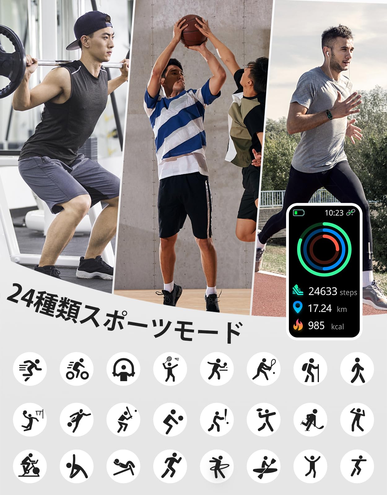 * 「24種類の運動モード·IP68防水」スマートウォッチL2には24種類の運動モードがあります。ランニング、ウォーキング、登山、ヨガなど、あらゆる種類の運動に対応しています。運動中にこのウォッチを身につけて、自分自身のフィットネスレベルを向上させましょう!さらに、このウォッチはIP68の防水機能を備えており、普段は手や顔を洗うときに外す必要はありません。しかし、海水、プール、お風呂、サウナ、温泉などの熱い水中では使用できません。これらの環境下で使用すると、ウォッチが損傷する可能性があります。使用する際には、この点にご注意ください。