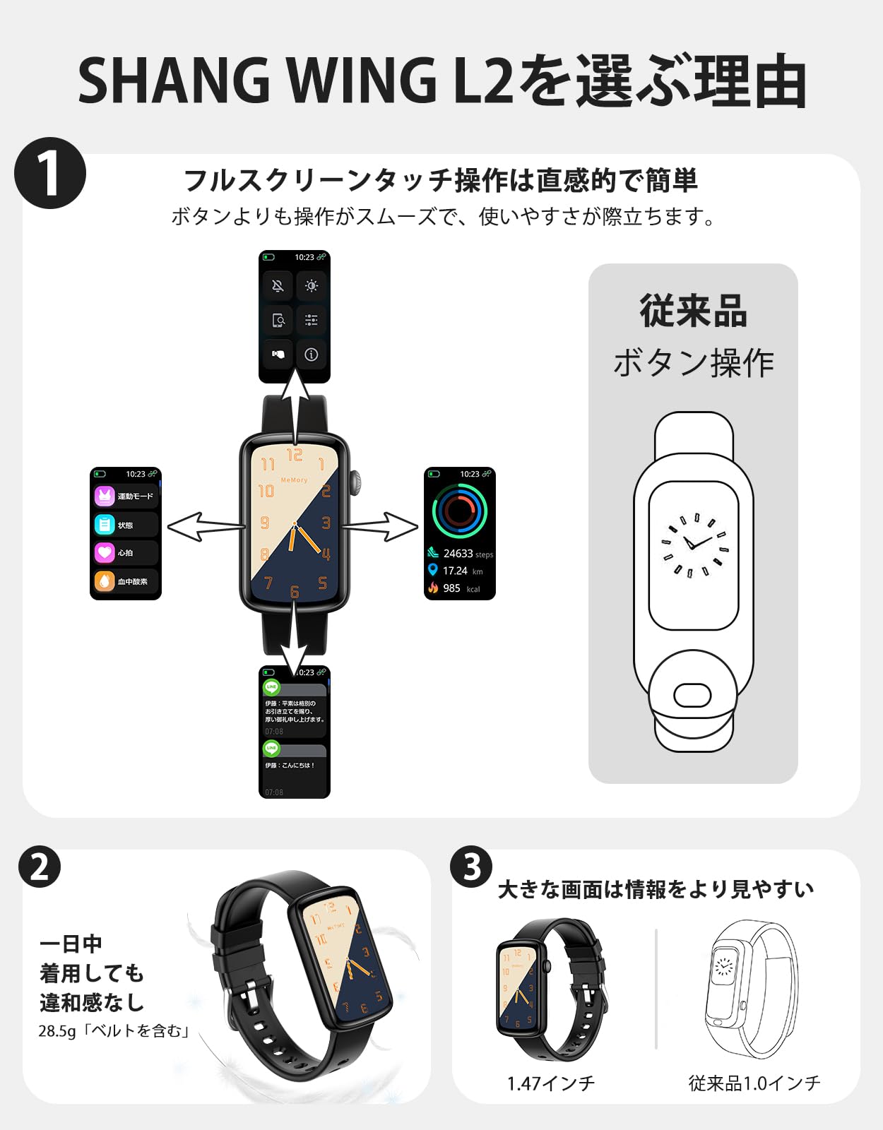 SHANG WING スマートウォッチ レディース iphone対応 アンドロイド対応 リストバンド型 腕時計 1.47インチ大画面 フルタッチ Smart Watch 着信通知 女子生理サイクル記録 多種類運動モード 天気予報 IP68防水 文字盤自由設定 誕生日 クリストマス 新年 ギフト 日本語説明書付き Lynn2 ブラック