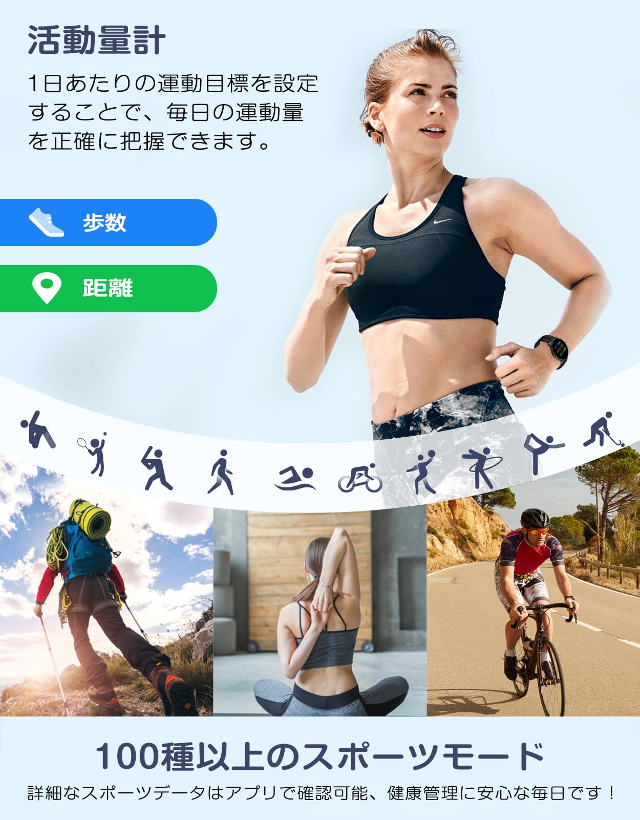 * 【歩数計・IP68防水防塵・多言語対応】毎日の歩数、歩行距離などの日々の運動データを一目で確認できます。座りすぎ通知、呼吸エクササイズ、女性の月経周期などの機能が搭載されており、アプリ上では詳細な分析も提供され、自分自身の状態をより明確に理解することができます。IP68の高い防水・防塵レベルで、普段の生活で手を洗ったり、顔を洗ったりする際には腕から外す必要がありません。注意:高温の環境である温泉、サウナ、海水、お風呂などで使用しないでください。また、APPと接続後、スマートウォッチを日本語、英語、韓国語など18言語に設定可能です。