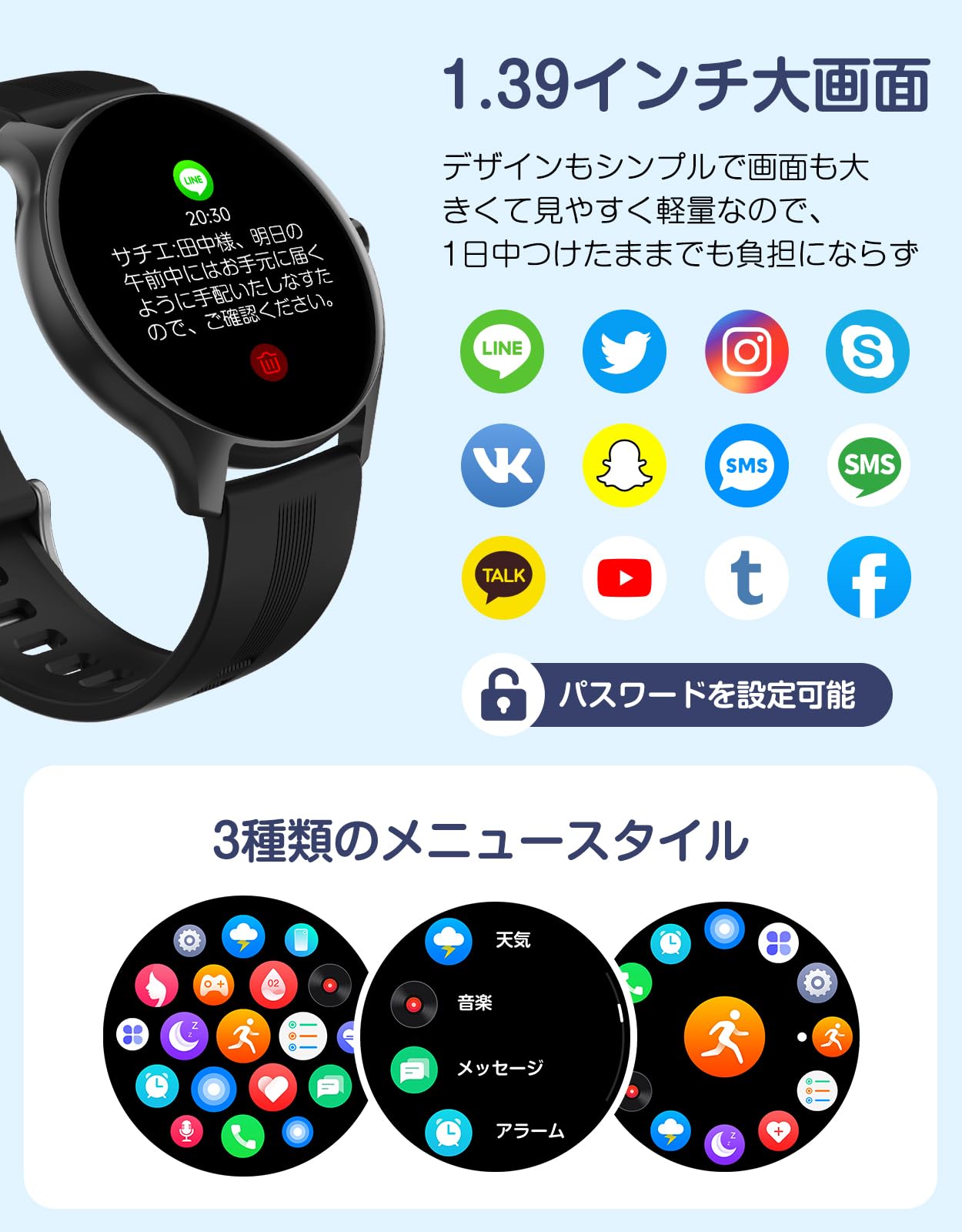 HUAKUA スマートウォッチ iPhone アンドロイド対応 通話音声調整可 一発消音 SOS通話機能付き Smart Watch 1.39インチ大画面 丸型 腕時計 歩数計 着信通知天気予報 IP68防水 長持ちバッテリー 長座注意 スマート探す 日本語説明書 TELEC認証済み