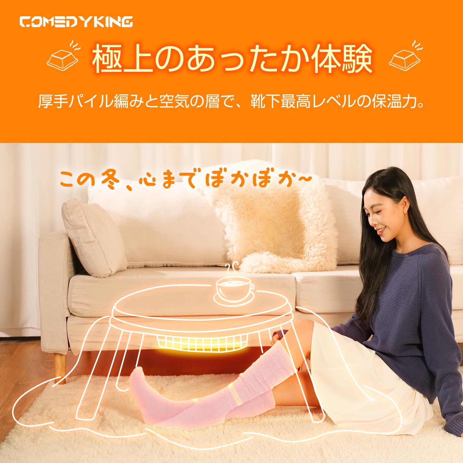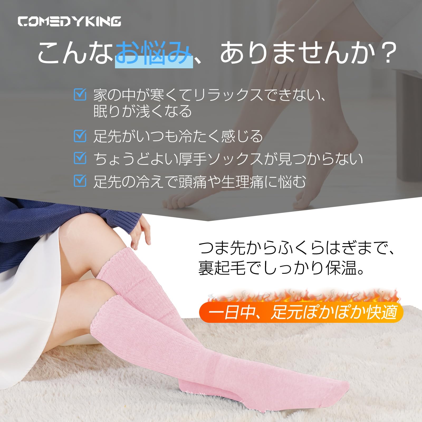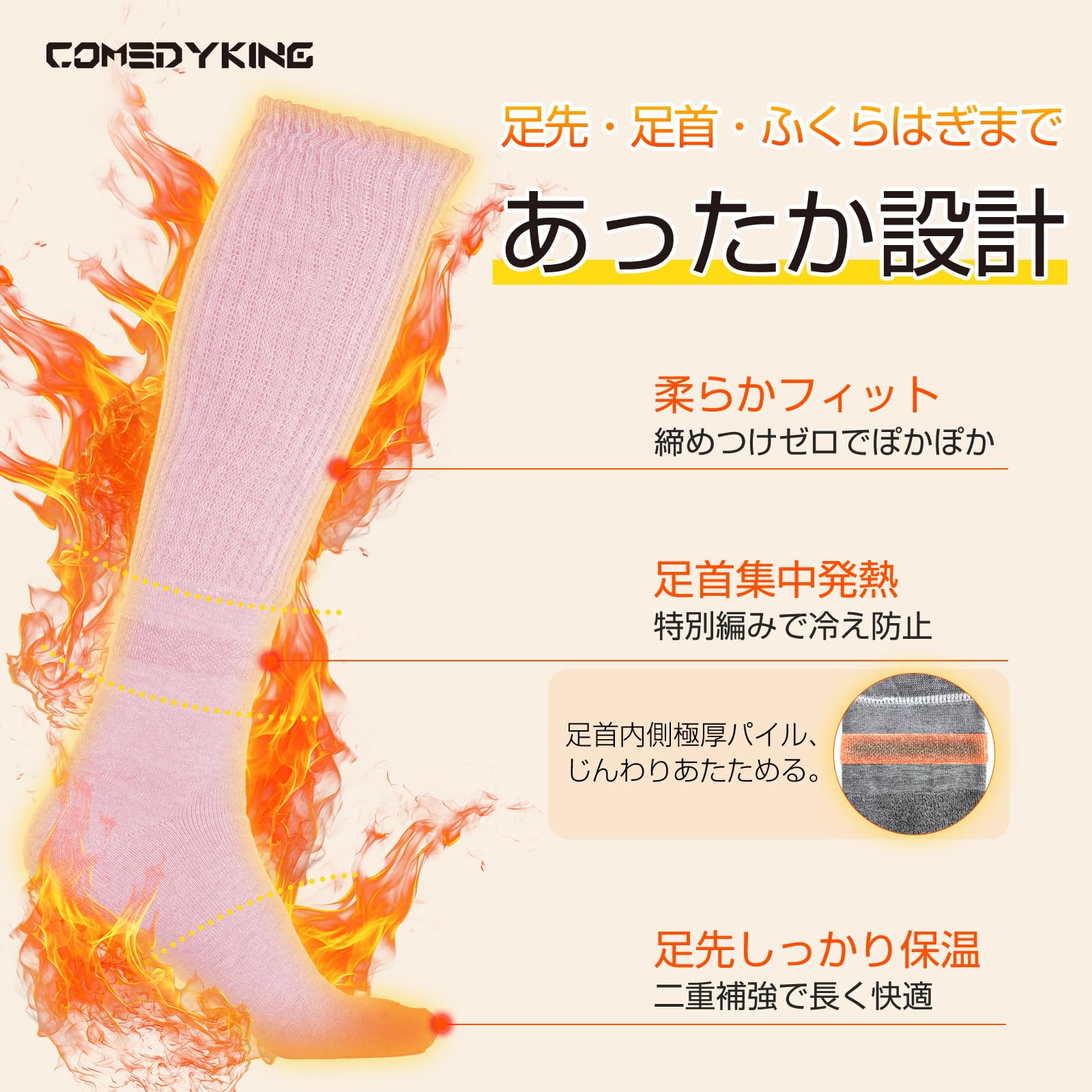* 【COMEDYKING 2025年新作・温活ソックス】 2025年冬、冷え性対策市場に革新をもたらす「あったか靴下」がついに登場。COMEDYKINGが繊維科学と日本式の温活文化を融合させ、快適さと機能性を極限まで高めました。最大の特長は「脚首特厚パイル」と「吸湿発熱繊維」のダブル構造。人体の「冷えの起点」である足首を徹底的に守り、靴下内部の熱を逃さずキープ。さらに、ポリエステル×アクリルのハイブリッド素材は、ウールより15%高い保温力と優れた耐久性を誇り、毎日使っても型崩れせず、快適な履き心地を持続。まさに「履くだけで温活」を叶える、冬の新しい常識です!