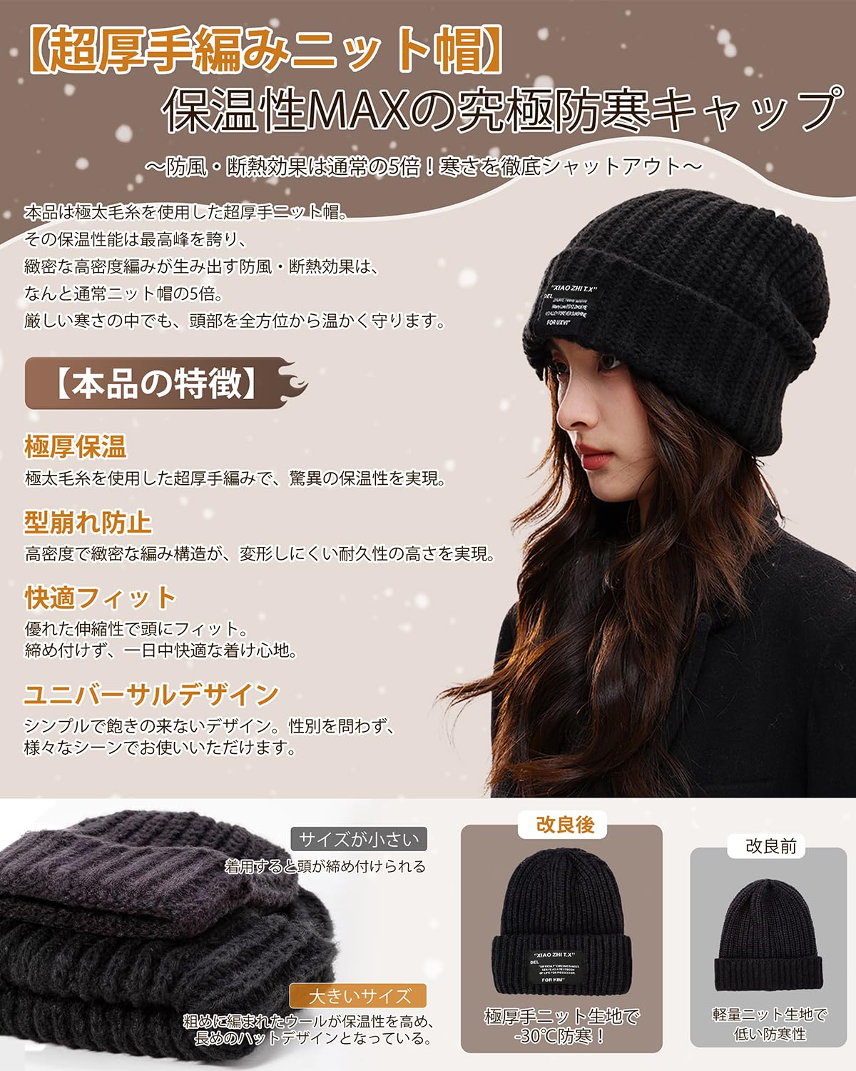 * 【極寒対策でポカポか持続】極厚毛糸で編んだこだわりの帽子です。頭全体をしっかり包み込み、冷気をシャットアウト!-15℃の厳しい寒さでも暖かさをキープします。360度防寒で耳までしっかり守るから、寒い日の外出も安心。ふんわり柔らかな肌触りで、一日中被っていても締めつけ感なし。肌に優しい素材だから、かゆみや刺激の心配もありません。