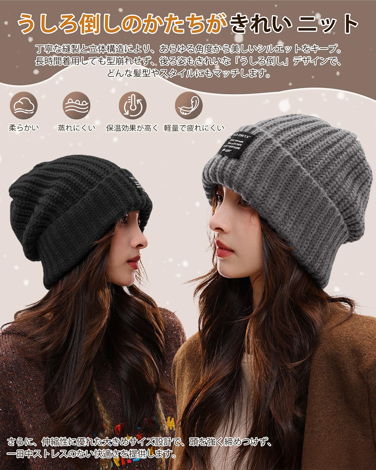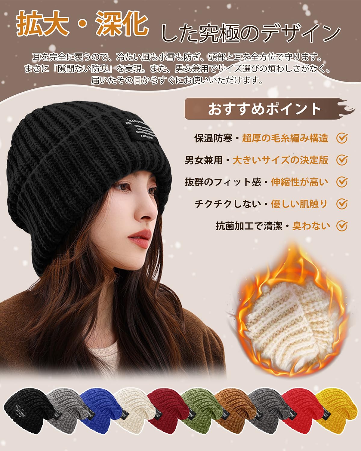 * 【極寒対策でポカポか持続】極厚毛糸で編んだこだわりの帽子です。頭全体をしっかり包み込み、冷気をシャットアウト!-15℃の厳しい寒さでも暖かさをキープします。360度防寒で耳までしっかり守るから、寒い日の外出も安心。ふんわり柔らかな肌触りで、一日中被っていても締めつけ感なし。肌に優しい素材だから、かゆみや刺激の心配もありません。