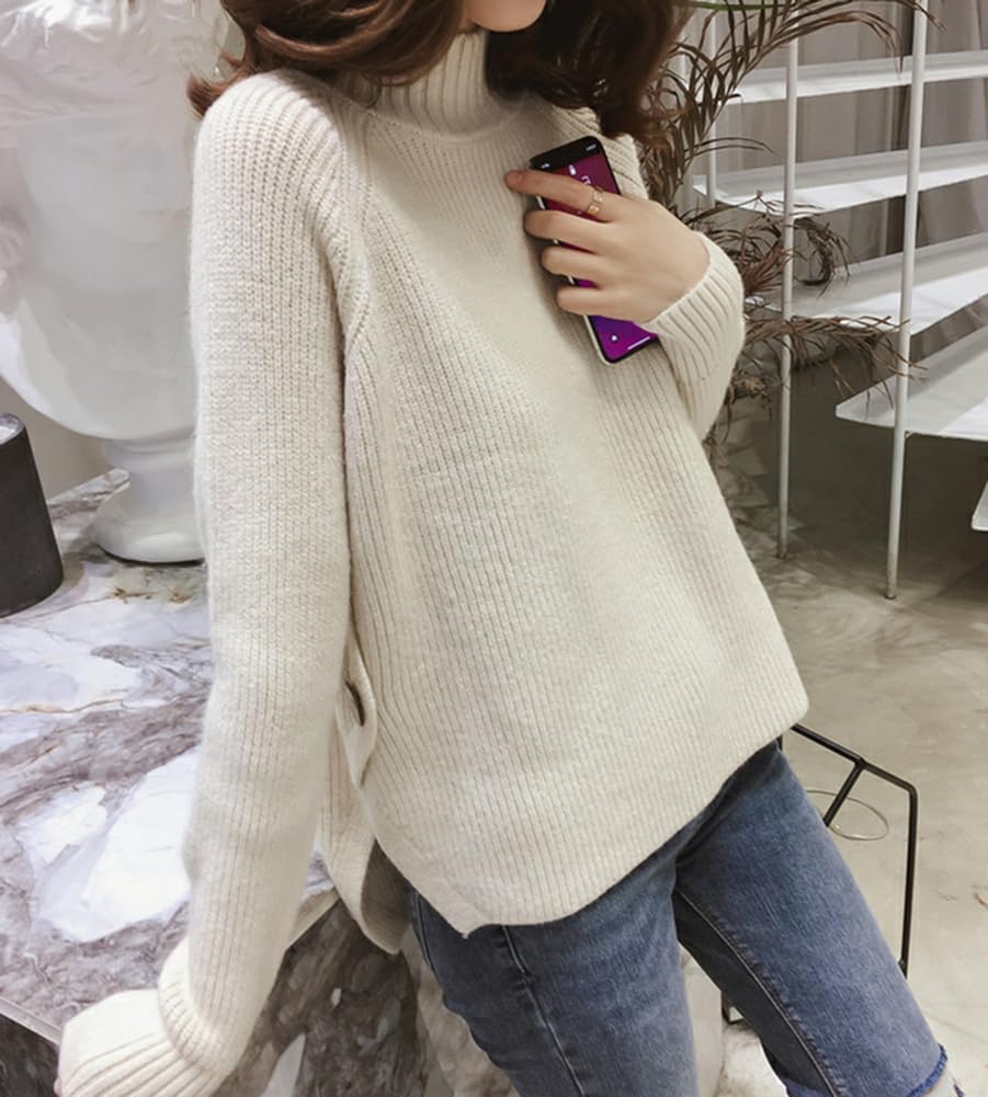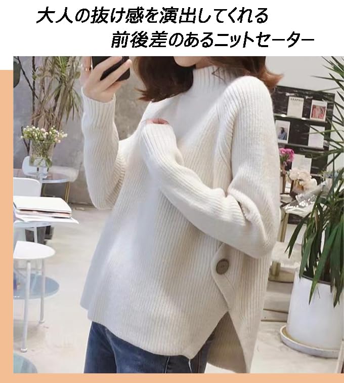 [Celetree] ニット セーター トップス レディース ハーフネック 長袖 サイドボタン ゆったり 可愛い (JP, アルファベット, Free Size, ホワイト)