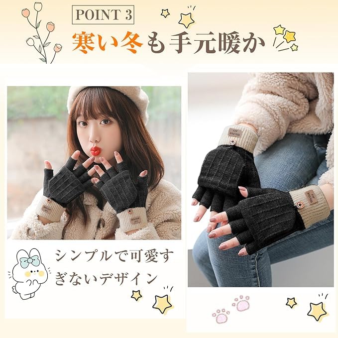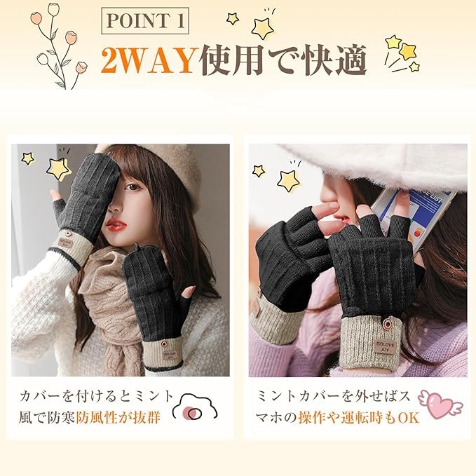 * 【タッチパネル対応!】指先の出し入れが簡単に出来るので、券売機やATMなどタッチパネルの操作も楽々、指先を出した時は、フードをボタンで固定できます。寒い時は指先を隠してしっかり保温できで、いちいち手袋を脱がなくても細かな作業が可能です。