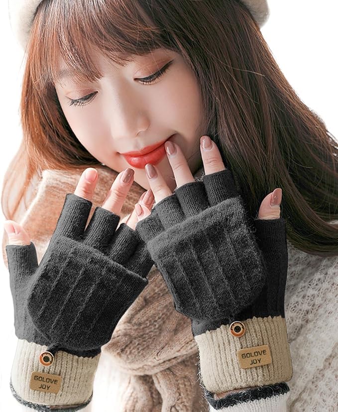 [CANFEEL] 2025年スマホ対応手袋 レディース 手袋 2way ストライプ編み柄 指なし・ミトン切替 暖かい 手ぶくろ カジュアル フード付き 秋冬 通勤 通学 自転車 防寒 ニットグローブ (ブラック)