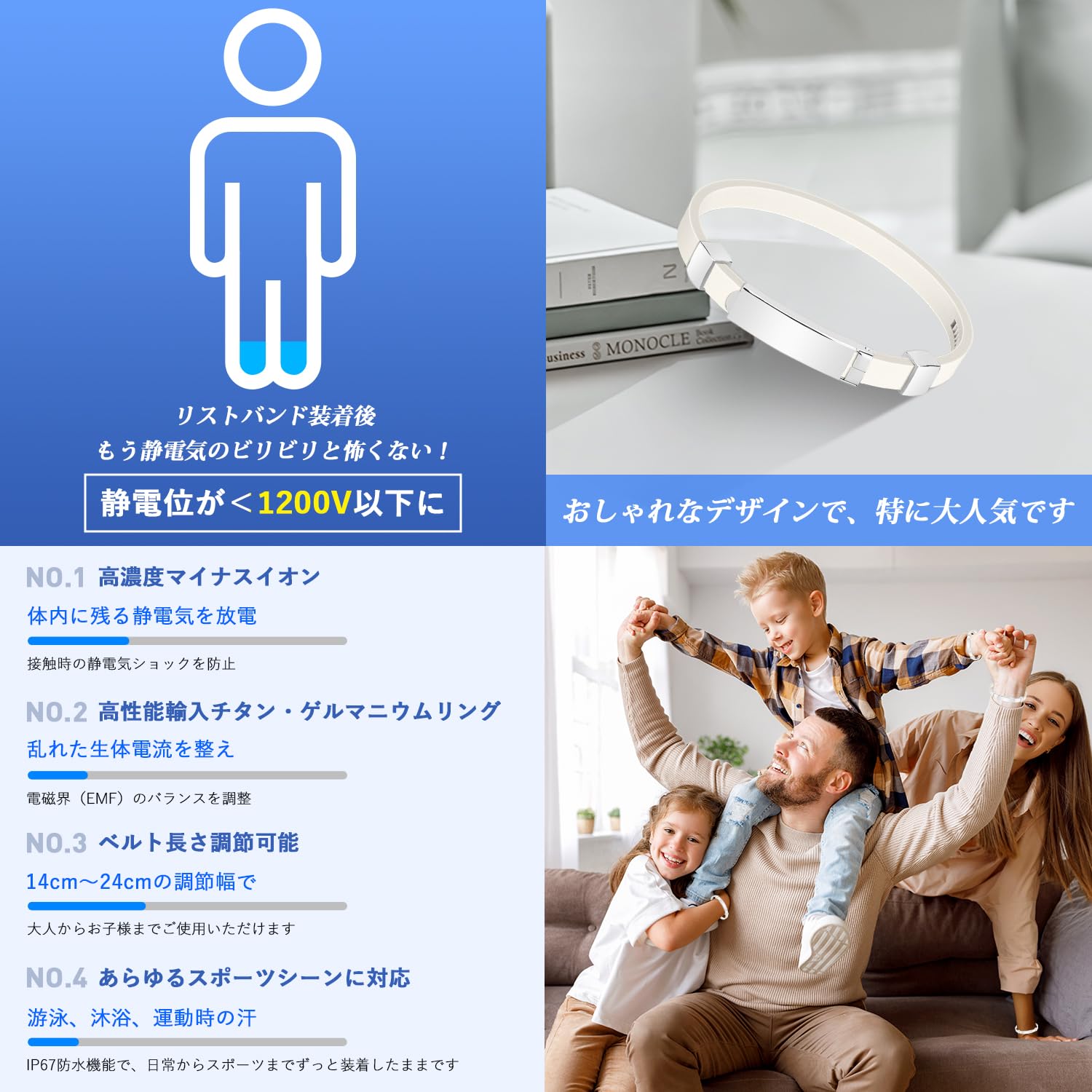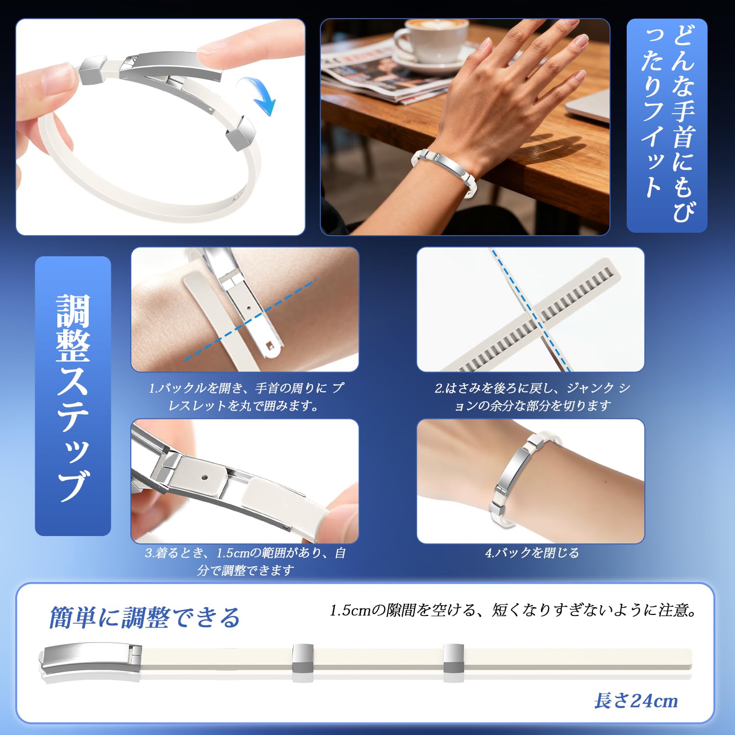* 【サイズ調節可能】全長約24cmで、調節可能です。 お客様の手首サイズに合わせて長さをカットしていただけます。体内の静電気を常時感知・放電し続けることで、睡眠の質向上、体力強化、静電気軽減が期待できます。