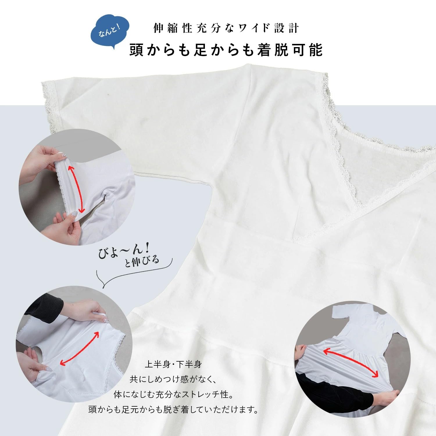 * 【打ち合わせ式の胸元 髪セット後に着用OK】、頭からも足元からも脱ぎ着していただけます。大きく開いた打ち合わせ式の胸元で、髪をセットした後でも 安心して着用できます。