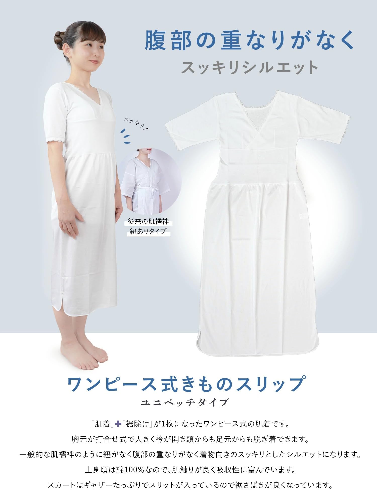 * \ストレスフリーの新発想/紐なしでウエストすっきり「ユニペッチ きものスリップ」。一般的な肌襦袢特有のゴワつきがなく、着物向きの美しいシルエットを叶えます。