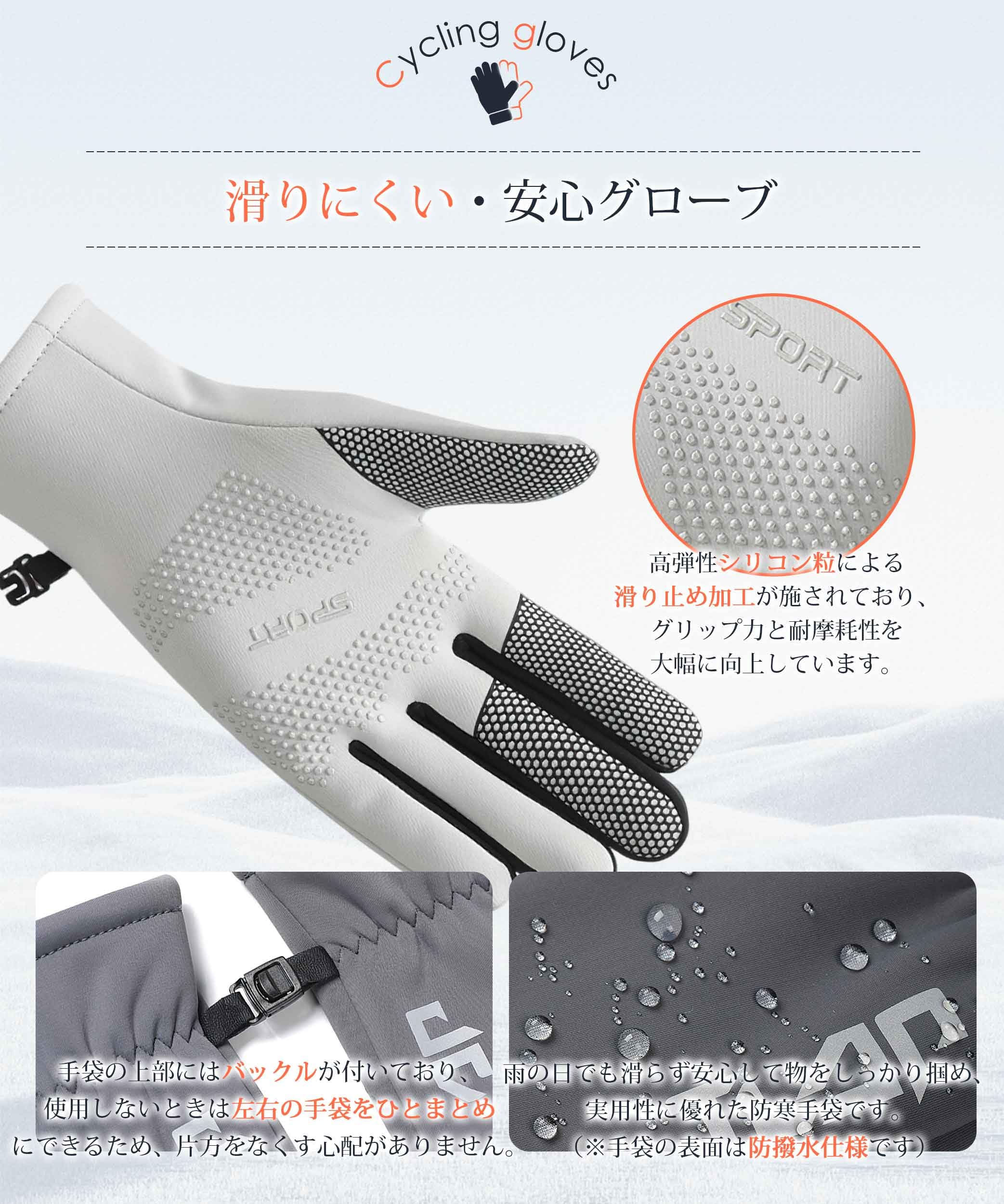 * 【滑りにくい・安心グローブ】 手袋の上部にはバックルが付いており、使用しないときは左右の手袋をひとまとめにできるため、片方をなくす心配がありません。手袋 レディースには高弾性シリコン粒による滑り止め加工が施されており、グリップ力と耐摩耗性を大幅に向上しています。スマートフォン操作時はもちろん、自転車やバイクのハンドルを握る際にも滑りにくく、安定感をしっかりキープします。手袋 レディースは手のひらから指先まで広範囲に配置した滑り止め粒が、雨の日でも滑らず安心して物をしっかり掴め、実用性に優れた防寒手袋です。(※手袋の表面は防撥水仕様です)