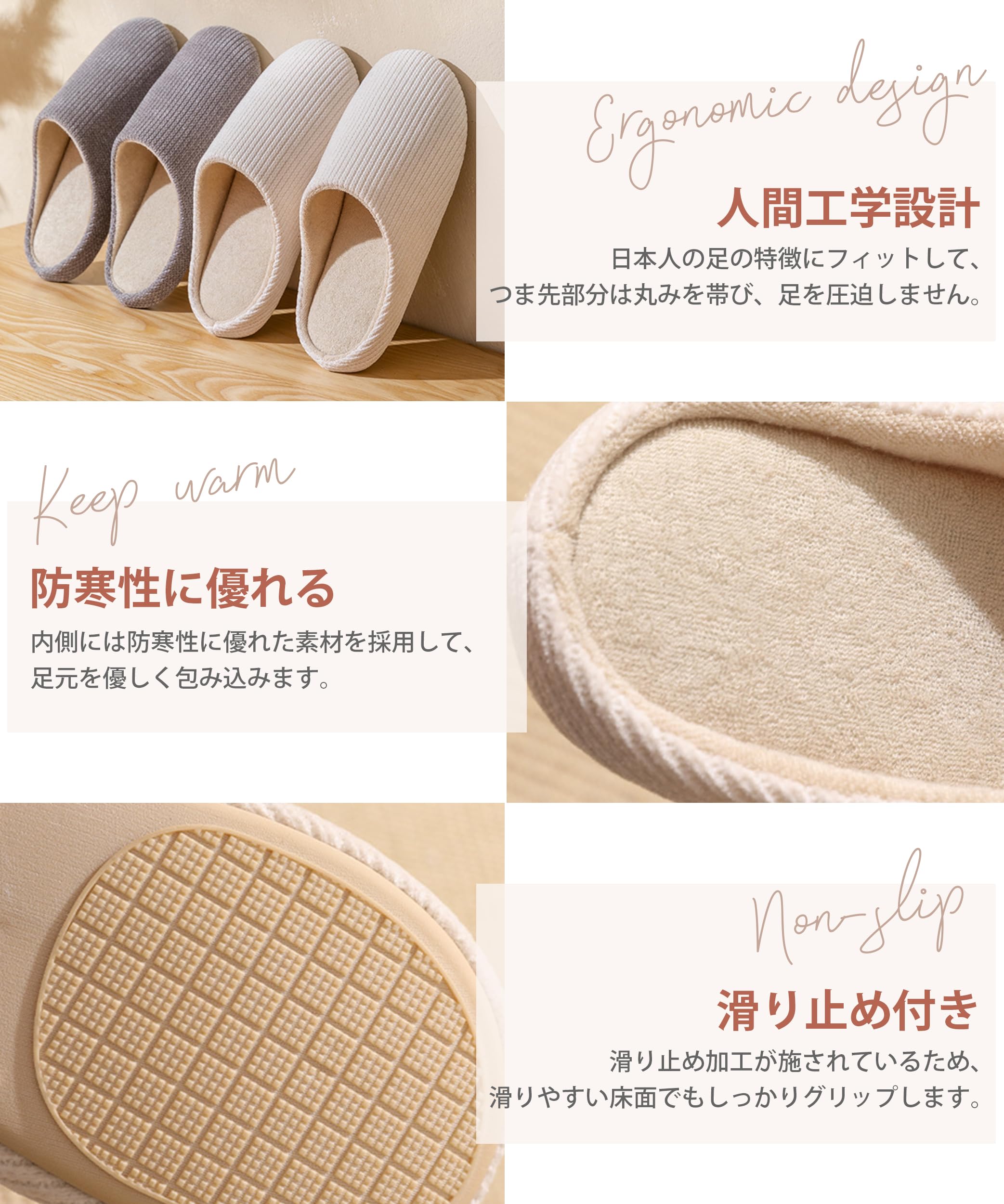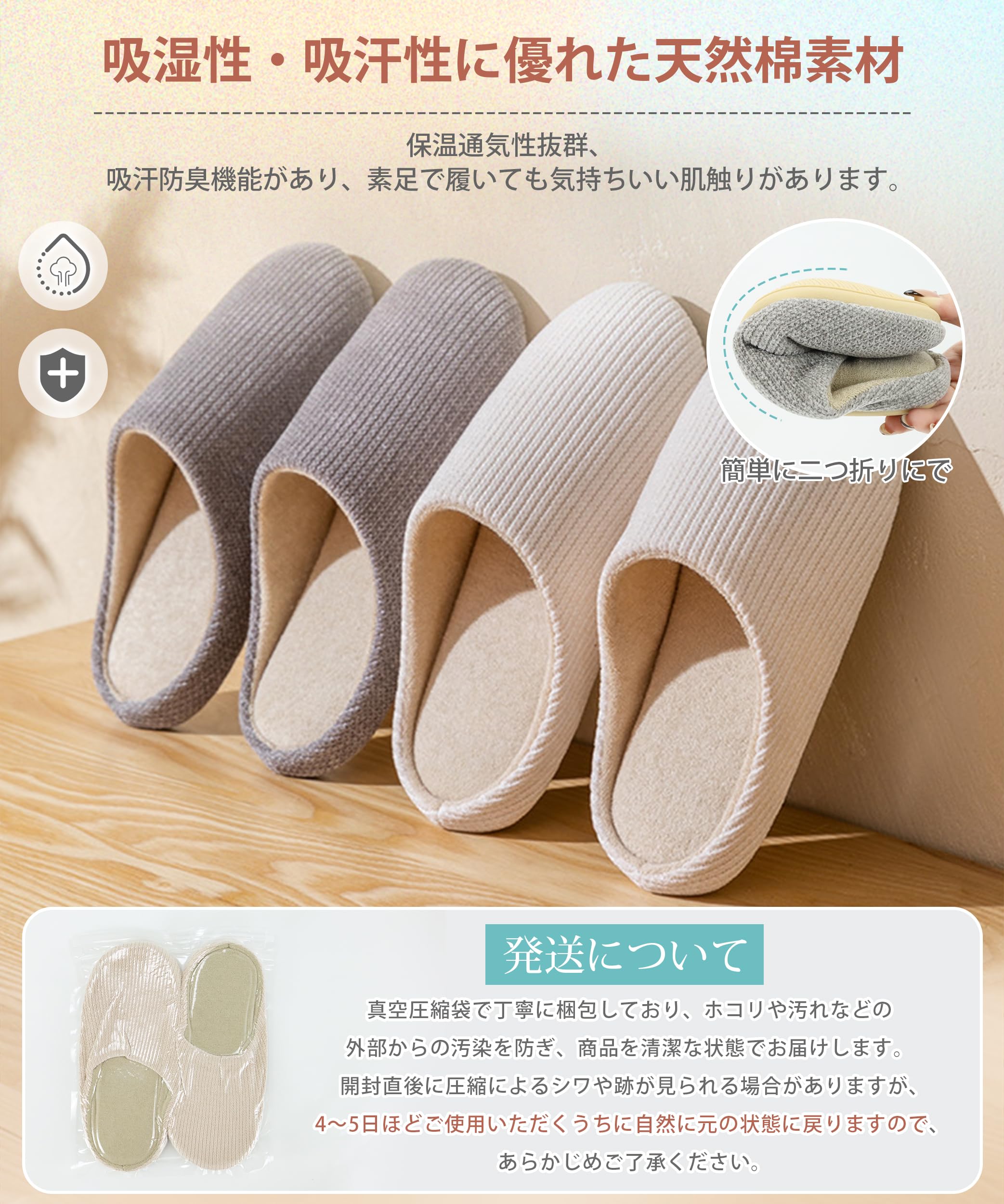 * 【上質素材で履き心地良い・通気防臭】ルームシューズの表地は上質な綿を採用して、中に通気のタオル布を付き、柔らかくて快適、素足で履いても気持ちいい肌触りがあります。日本人の足の特徴にフィットして、ルームシューズのつま先部分は丸みを帯び、足を圧迫せず快適な履き心地を実現します。吸湿性・吸汗性に優れた天然棉素材を使用するスリッパは、保温通気性抜群、吸汗防臭機能があり、脚臭発生しにくいてす。ルームシューズはサラッと心地良い肌触りと、防寒性も優れた素材で、暖かくて、蒸れずに毎日快適にご使用いただけます。
