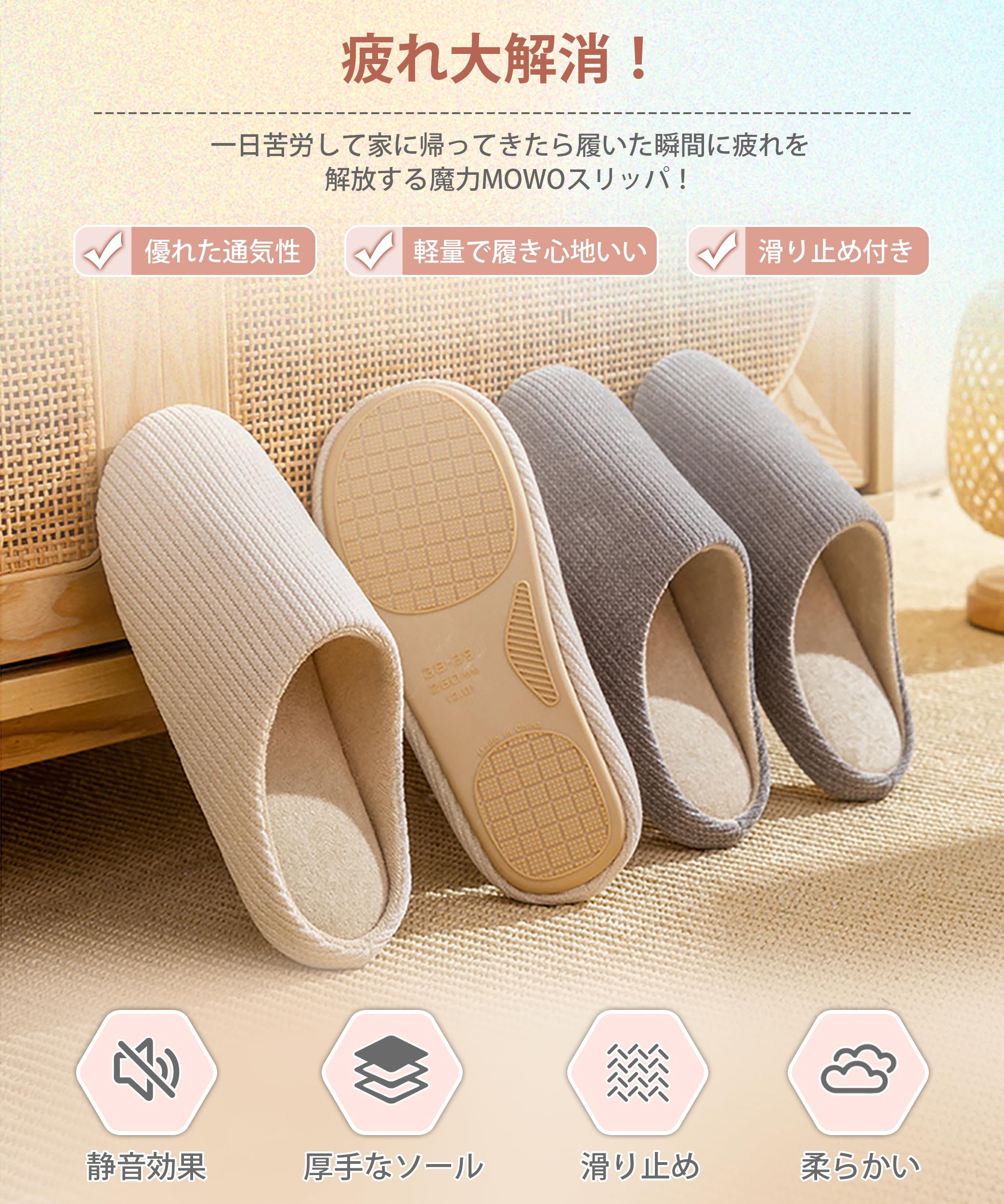 * 【疲れ大解消!柔らかいソール】一日苦労して家に帰ってきたら履いた瞬間に疲れを解放する魔力スリッパです!しっかりとした厚みのルームシューズのインナーソールはふかふかなクッションが足を優しく包み込めて、まるで雲の上を歩いているような柔らかな踏み心地です。ルームシューズは約110g(片足)超軽量で、動きやすいため、家の中での移動や家事中にもストレスなく使えます。ふわモコのルームシューズで足に優しく、自宅での快適な時間を満喫できます。※真空圧縮袋で丁寧に梱包しており、開封直後に圧縮によるシワや跡が見られる場合がありますが、4〜5日ほどご使用いただくうちに自然に元の状態に戻りますので、あらかじめご了承ください。