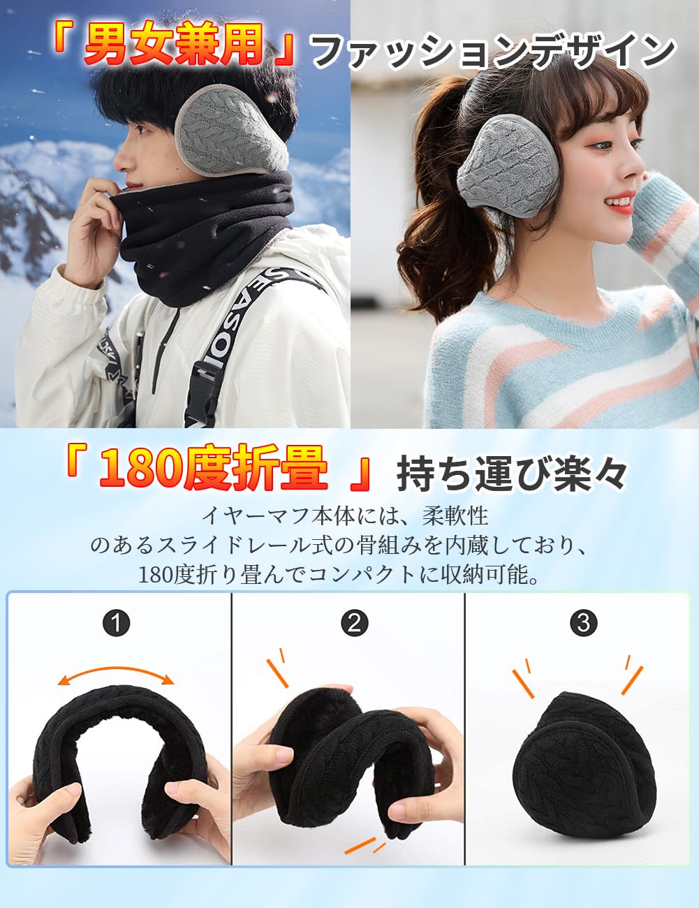 * 【180度折畳み・収納便利】使用しない時は、左右のイヤーマフ部分を180度回転させてコンパクトに折りたたみ可能です。カバンやポケットにすっきり収納できるため、持ち運びにもとても便利です。通勤・通学の際や旅行、アウトドアにも最適です。非常に軽量なため、長時間バッグに入れていても負担にならず、必要なときにすぐに取り出して使用できます。