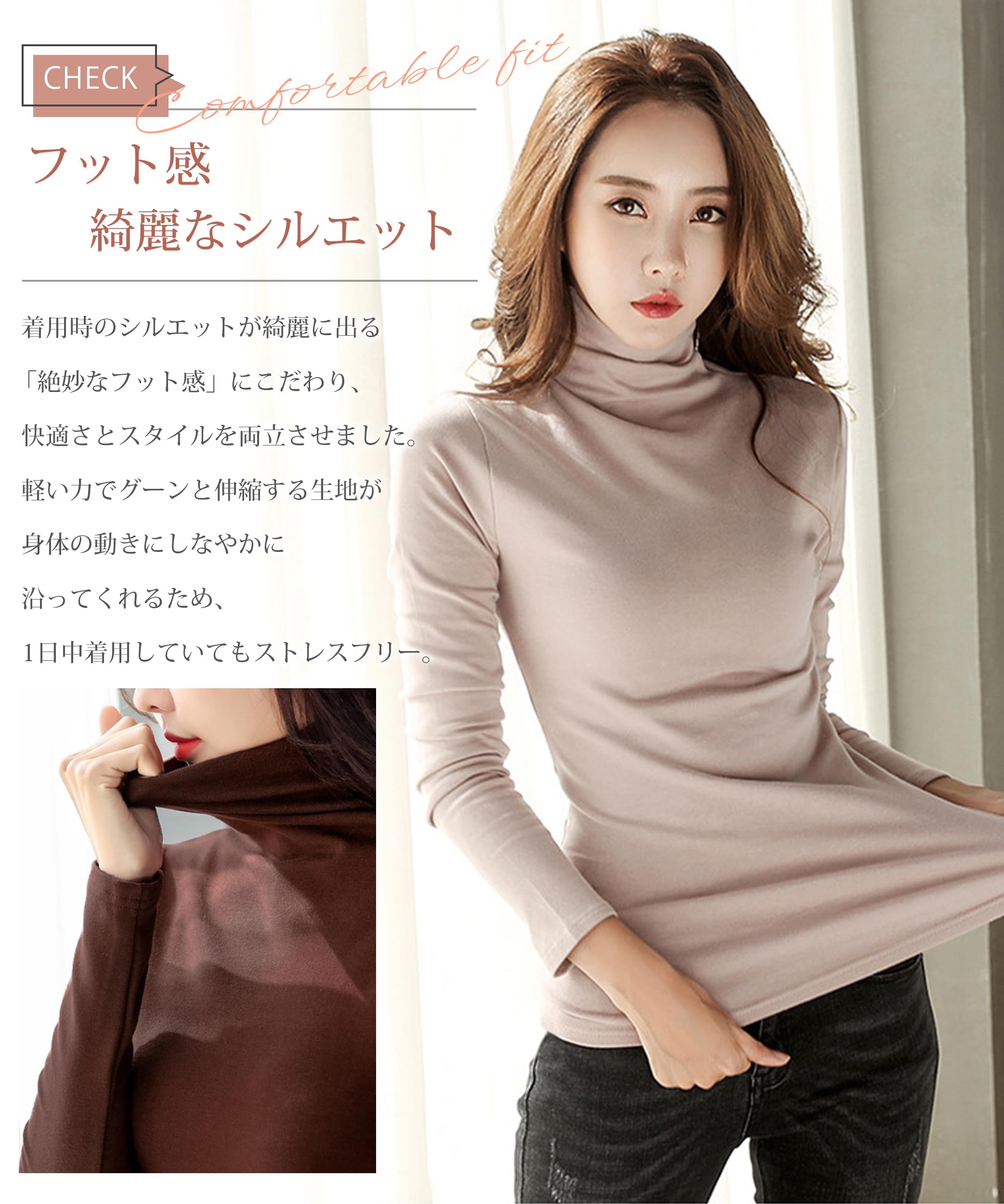 * 【美しいシルエット・女性らしさの演出】このタートルネックトップスは、女性らしい曲線美を際立たせるシンプルデザイン。体に優しくフィットしながらも締め付け感のない着心地で、スリムなシルエットを実現。ハイラウンドネックが首元を美しく引き立てます。顔周りをすっきりと見せ、洗練された印象に。