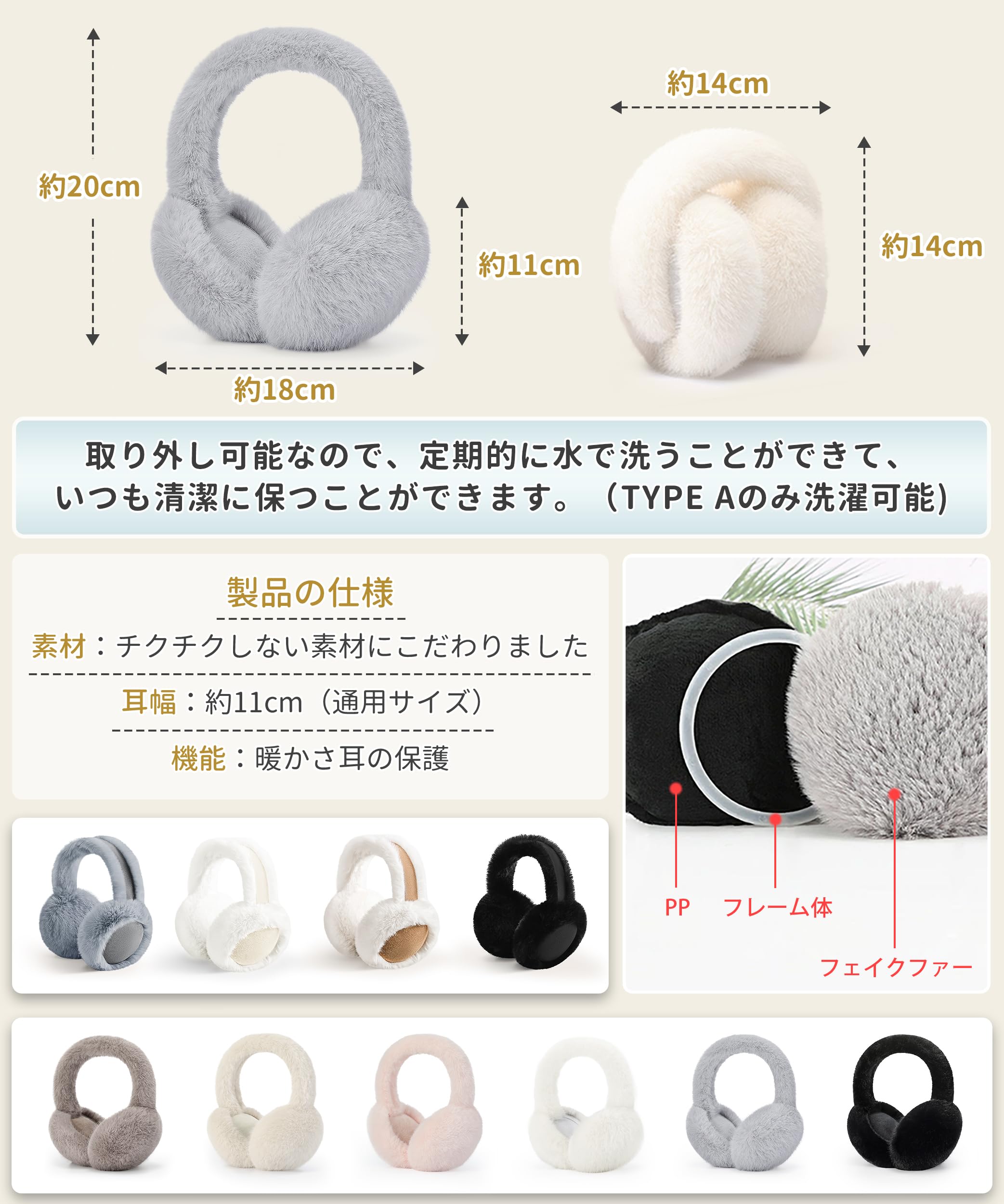 * 【ふわふわ極上の肌触り ・TYPE Aのみ洗濯可能】このイヤーマフはの内側に使用されているのは、厳選された高品質のロングパイルファー素材。その特徴は、何と言っても比類なき柔らかさと滑らかさ。イヤーマフの耳に当たる部分は、まるでうさぎの毛並みを思わせるような、驚くほどのなめらかさとふわふわ感。イヤーマフは耳を優しく包み込み、チクチク感やかゆみ、擦れによる不快感は一切なし。イヤーマフは長時間の使用や繰り返しの着脱にも耐える上質なファーを使用しているため、耳の皮膚を優しく保護し、摩擦による負担を最小限に抑えます。また、イヤーマフ レディース 取り外し可能なので、定期的に水で洗うことができて、いつも清潔に保つことができます。(TYPE Aのみ洗濯可能)