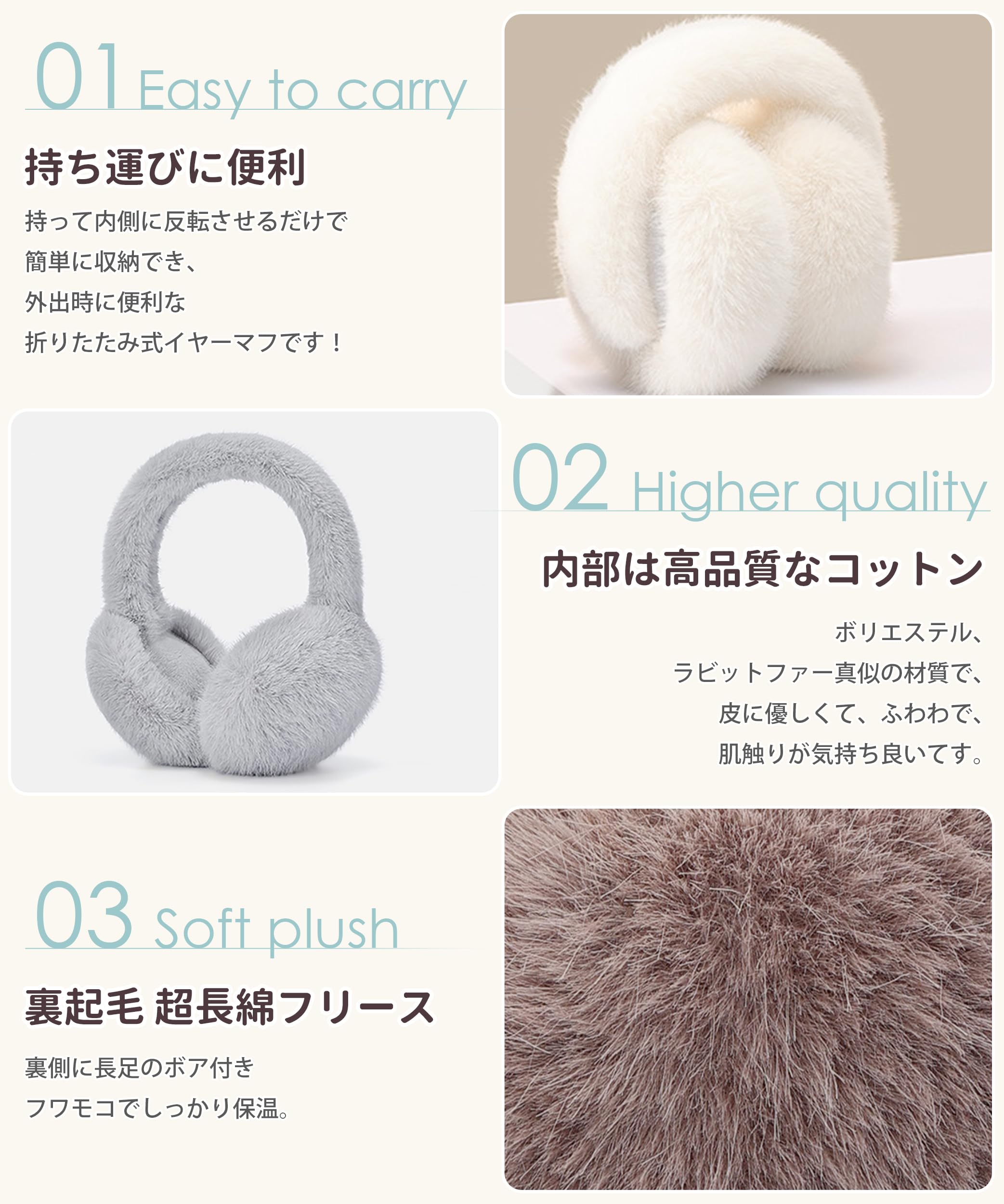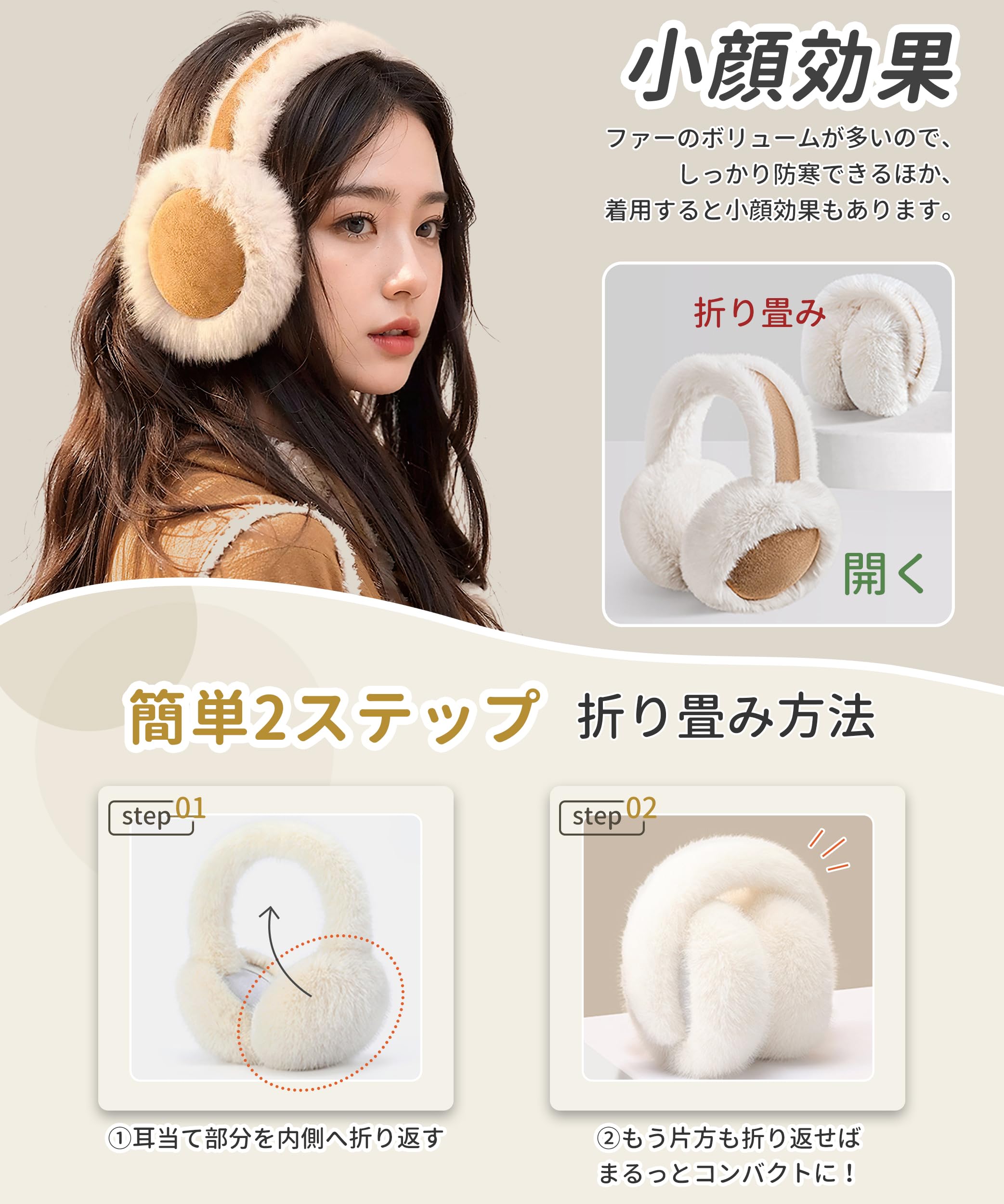 * 【折り畳み収納・小顔効果】超便利!このイヤーマフのアーム部分は柔軟性のある素材なので、使用しない時は左右の耳部分接触部を内側に折りたたむだけで簡単に収納でき、ポケットやバッグに収納可能です。さらに、イヤーマフは顔の両側を覆う広めの耳当てが、顔を視覚的にすっきり見せ、自然な「小顔効果」を演出します。イヤーウォーマーは保温性にも優れ、冬のファッションアイテムとして最適な選択です。