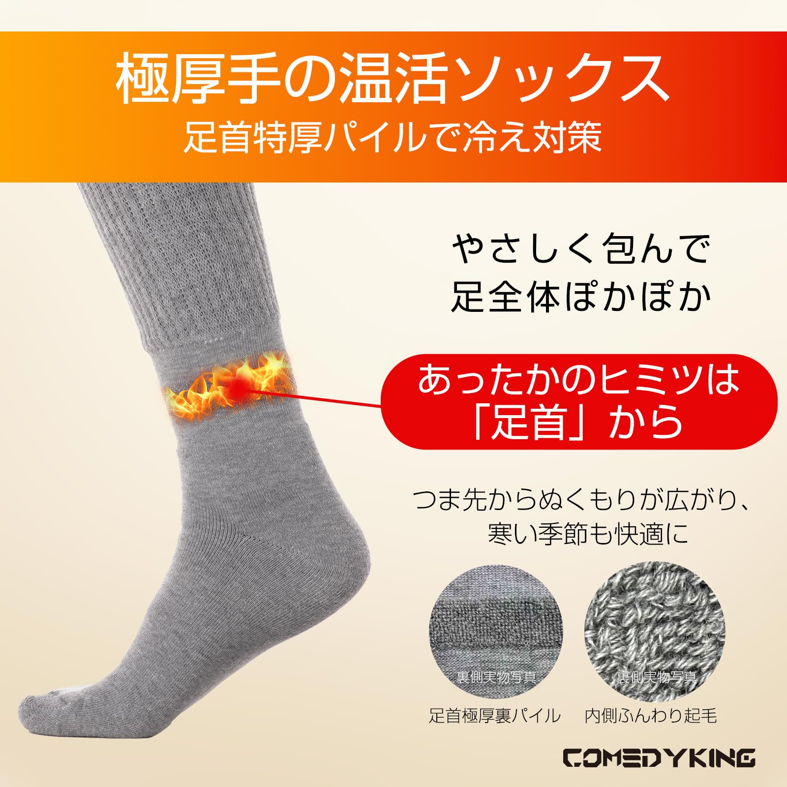 * 【COMEDYKING 2025年新作・温活ソックス】 2025年冬、冷え性対策市場に革新をもたらす「あったか靴下」がついに登場。COMEDYKINGが繊維科学と日本式の温活文化を融合させ、快適さと機能性を極限まで高めました。最大の特長は「脚首特厚パイル」と「吸湿発熱繊維」のダブル構造。人体の「冷えの起点」である足首を徹底的に守り、靴下内部の熱を逃さずキープ。さらに、ポリエステル×アクリルのハイブリッド素材は、ウールより15%高い保温力と優れた耐久性を誇り、毎日使っても型崩れせず、快適な履き心地を持続。まさに「履くだけで温活」を叶える、冬の新しい常識です!
