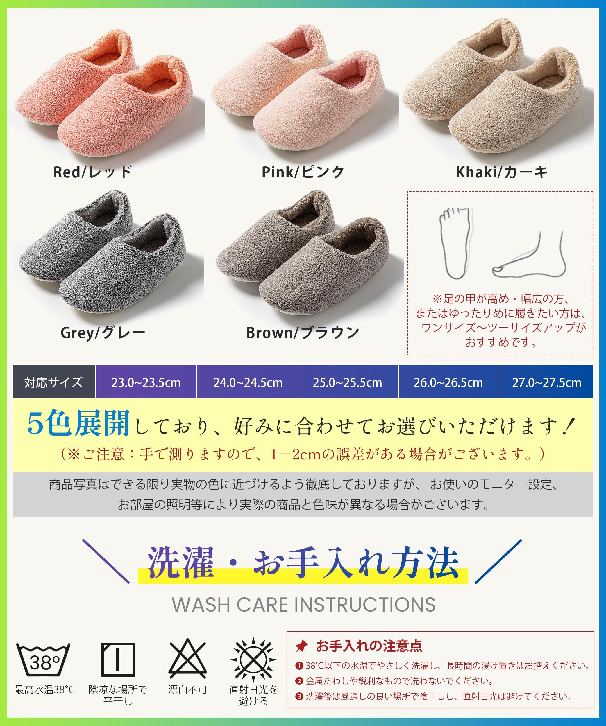 * 【かかと付きで冷え対策・4サイズ展開】AOYのスリッパ 室内はかかと付きデザインでしっかりフィットし、歩いても脱げにくい仕様、かかとまでしっかり包み込むから、冷えやすい足元をやさしくガードしてくれます。サイズは選べる4種類あり、23.0-23.5cm、24.0-24.5cm、25.0-25.5cm、26.0-26.5cm。※足の甲が高め・幅広の方、またはゆったりめに履きたい方は、ワンサイズ~ツーサイズアップがおすすめです。