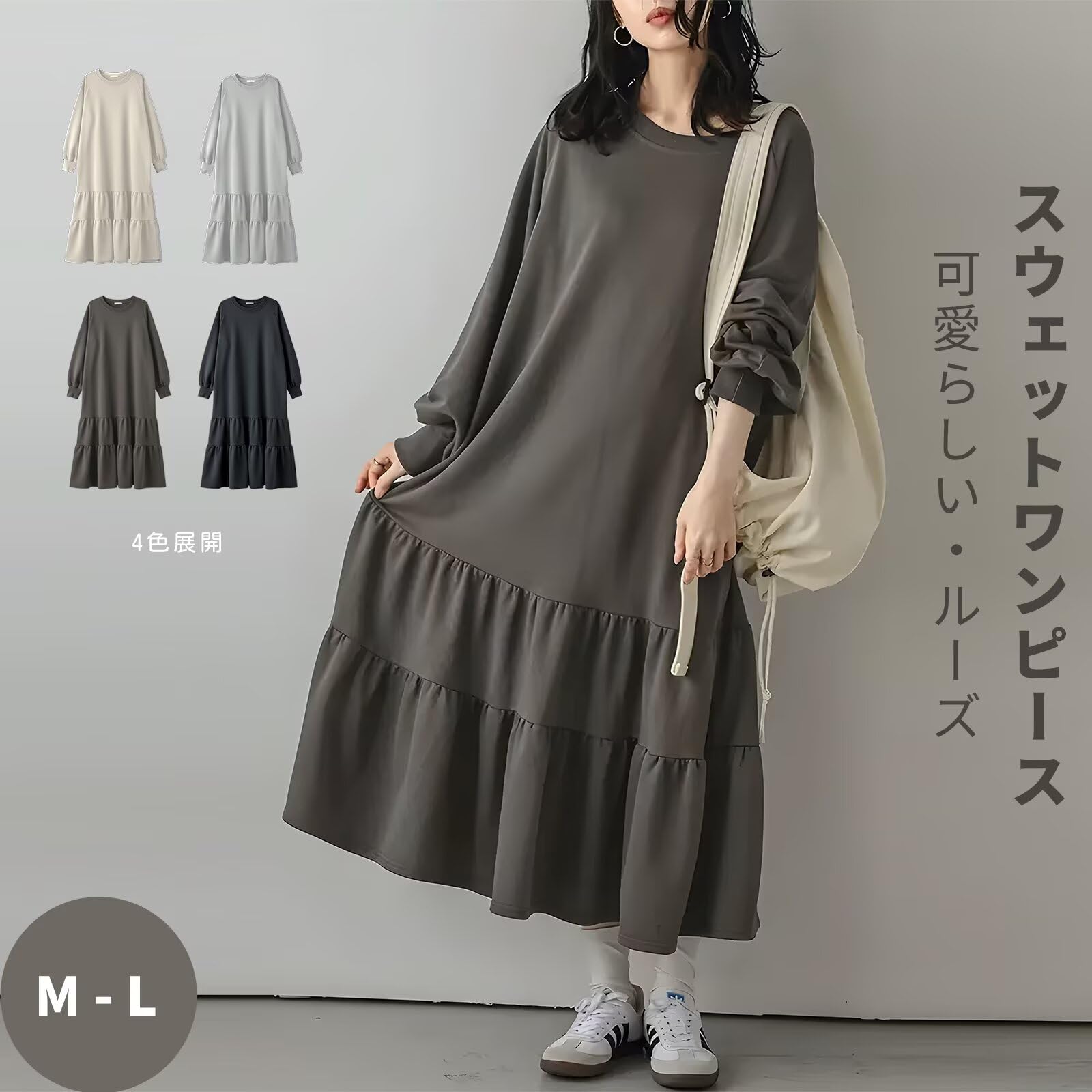 [Quiet Wave] スウェットワンピース レディース 長袖 体型カバー フリル裾 丸首 ロングワンピース 秋服 秋冬 マキシ丈 大きいサイズ リラックス かわいい