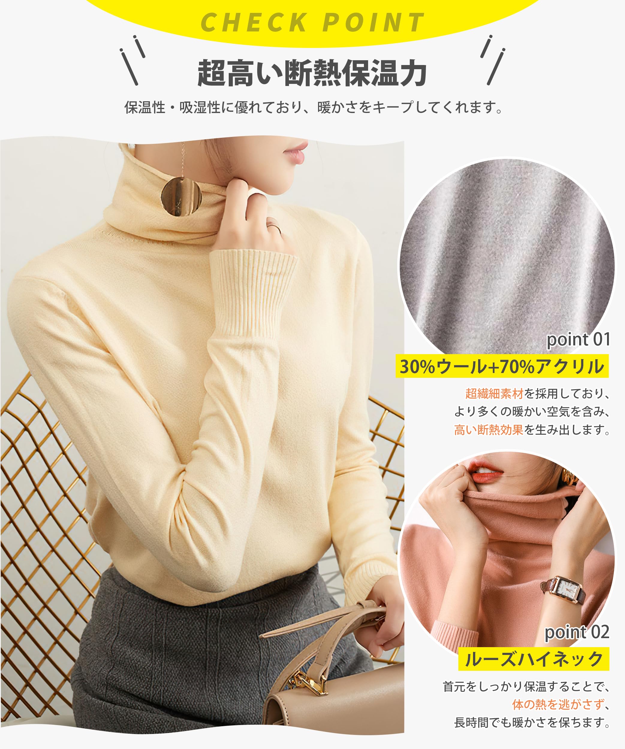 * 【ふんわりと柔らかい】優れた保温性と柔らかさを持つウール素材や、素肌によく馴染むアクリル素材を採用していたセーター。ふんわりとソフトな肌触りで、上質感のあるレディースハイネックセーター。タグによるチクチクした肌触りがないので、敏感肌の方も安心して着用できます。柔らかな風合いと落ち感に漂うレディースセーター、女性らしいしなやかな印象を与えます。