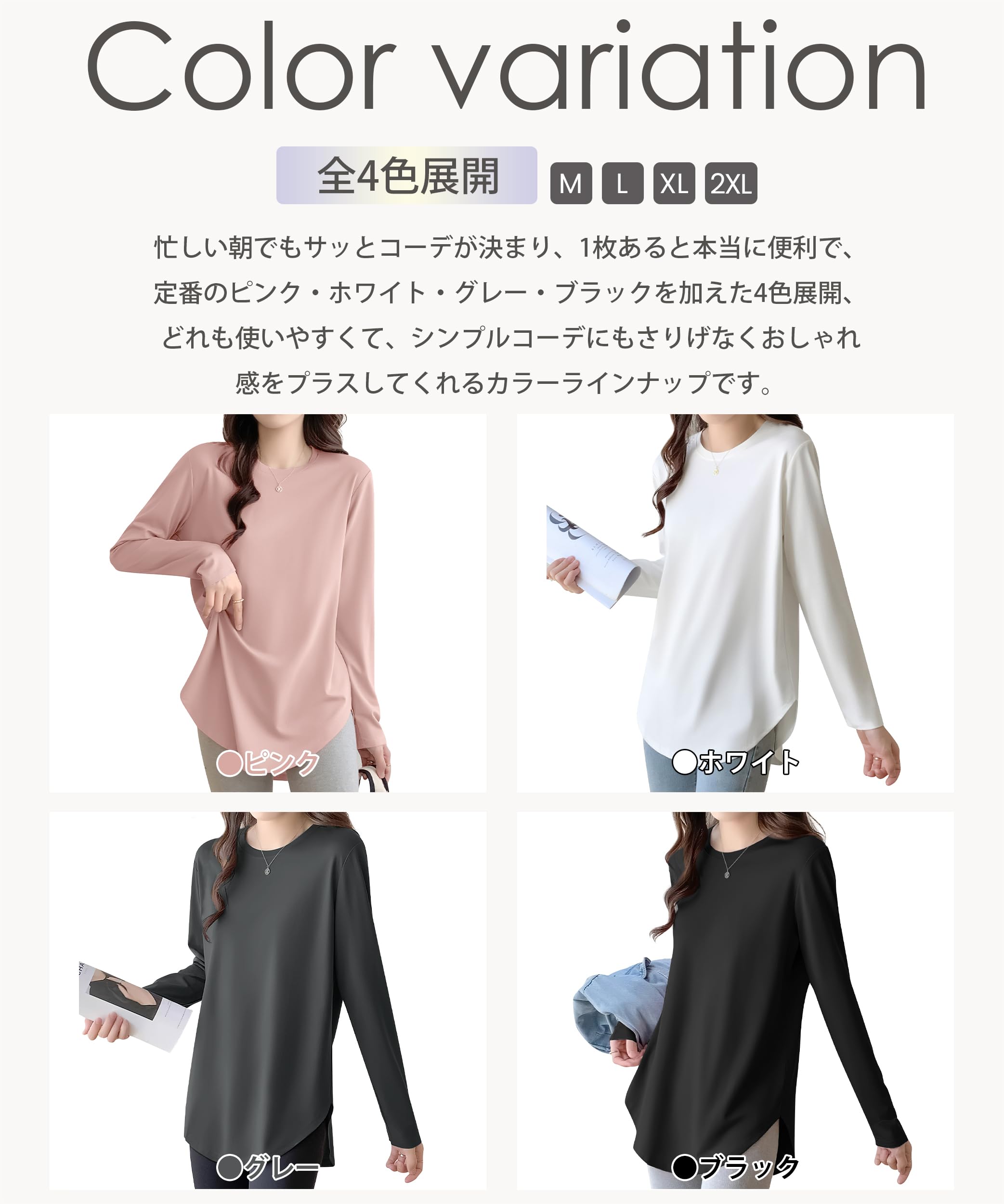 [AOY] Tシャツ レディース 長袖 トップス 【サイドスリット×ラウンドヘムで抜け感プラス・4色提供】 トップス カットソー ティーシャツ 丸首 クルーネック ラウンドヘム 柔らかい 伸縮性 着痩せ カジュアル ゆったり 重ね着 インナー 無地 (L, ホワイト)