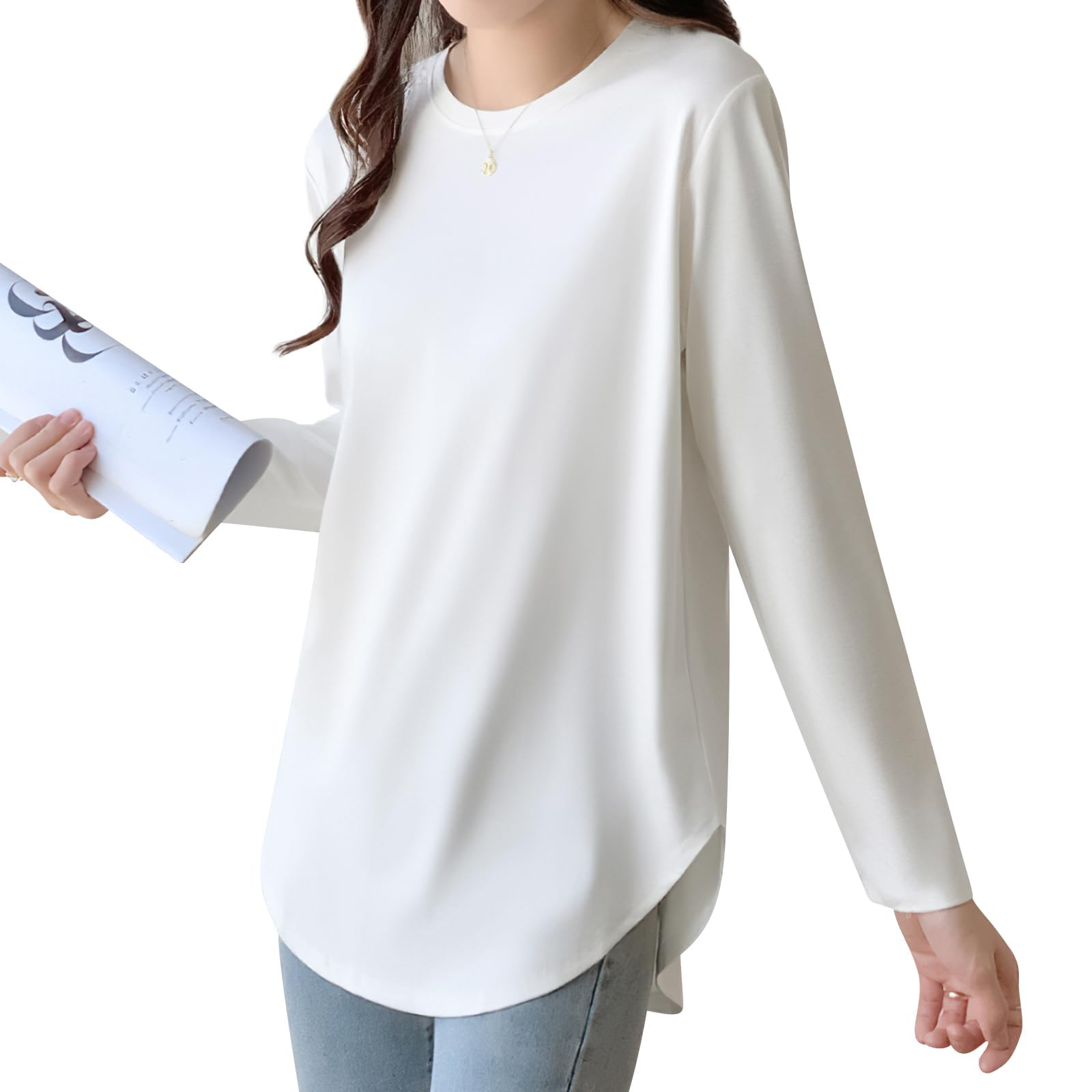 [AOY] Tシャツ レディース 長袖 トップス 【サイドスリット×ラウンドヘムで抜け感プラス・4色提供】 トップス カットソー ティーシャツ 丸首 クルーネック ラウンドヘム 柔らかい 伸縮性 着痩せ カジュアル ゆったり 重ね着 インナー 無地 (M, ホワイト)